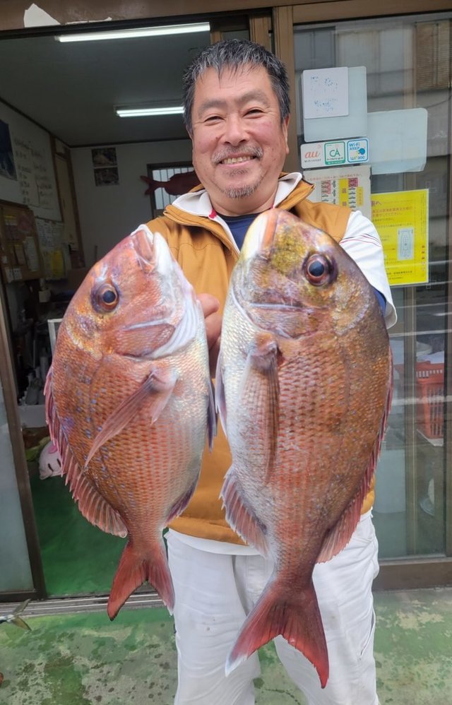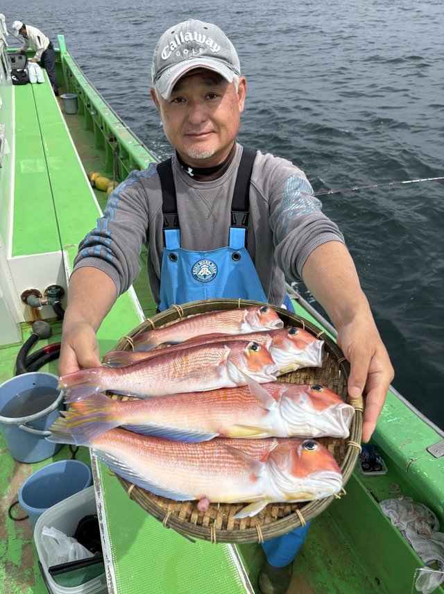 マダイ 0.40~1.60kg 0~5匹 ハナダイ アマダイ キントキ アジ サバ ヒラソウダ タイ船、今日はマダイは、2番手4枚船中15枚と好調でした。明日は予報悪く出船中止になります。