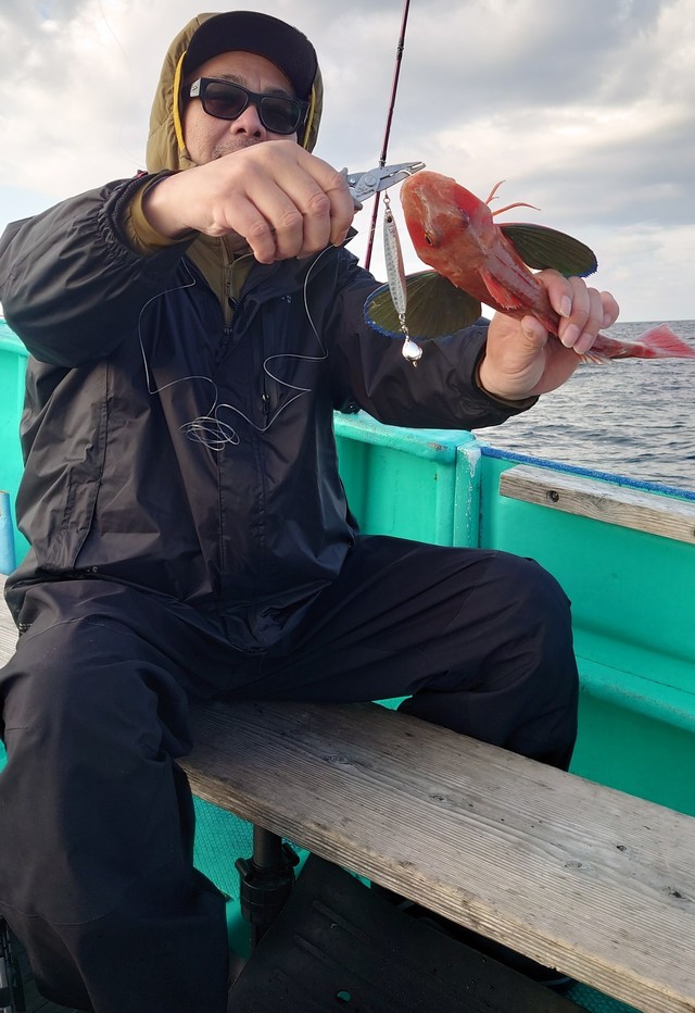 マダイ 予報より風が落ちなく風裏で 開始直ぐに塩焼きサイズですが1枚ゲットおめでとう御座います。 2枚目追加 風裏でも波が多少あり辛い感じでしたが ポチポチと釣れました。 風が落ちて 本命場所で サイズアップ おめでとう御座います。 外道は ホウボウでした。 ホウボウもサイズが良かったです。 バラしも有りましたがレンタルの方も当たりは有りましたがバラしになり残念でした。 3名で0〜3合計4枚でした。 お疲れ様でした。 次回のご予約お待ちしております。