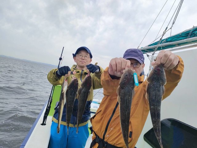 マゴチ 38~55cm 1~6匹 マゴチ船。 朝から南西強風でしたので、富津方面風影になるポイントを攻めました。 出れば大きいのですが、数はアタル感じではなかったですけどね。 餌は2本~6本ルアー組も全員ゲット成功残念賞なしなら上出来です。