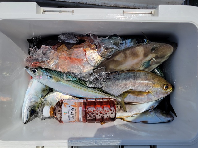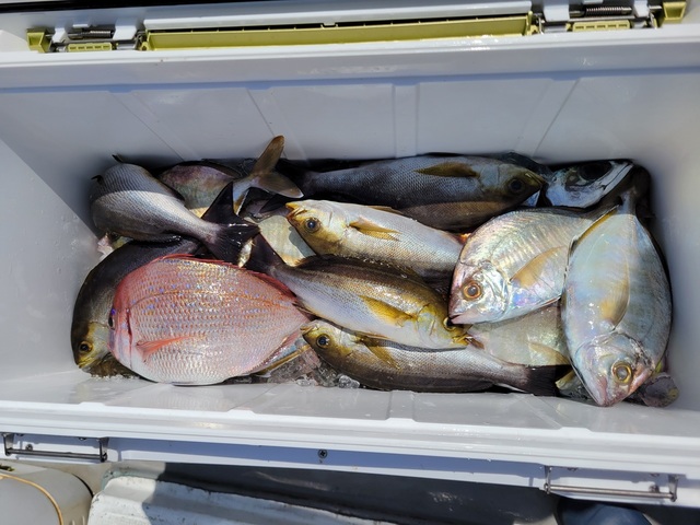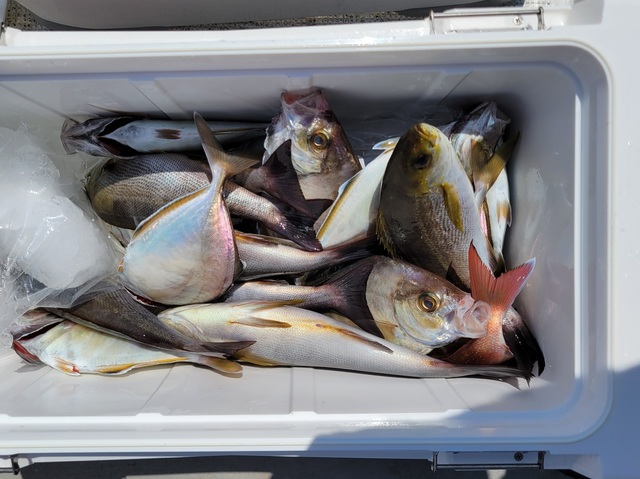 カイワリ マダイ ハナダイ イサキ メジナ アジ カイワリ五目に出船しました。 9時半早上がりでした。 入れ食いです!!