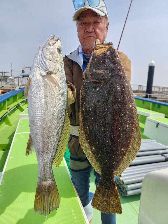 カワハギ 16~27cm 0~8匹 ショウサイフグ イシダイ 今日は最高のベタ凪釣行でした。 私はご指名いただき仕立船を 担当させて頂きました! ほぼビギナー様チームで ベタ凪だったのでクルージングも 楽しめました。 数はなかなか伸びませんでしたが 大型も顔を出してくれて 27.0cm、26.5cm、26.0cmと 分厚く肝パンハギをゲット! また水温が上がってしまったこともあり 生体反応は非常に多く 特にキタマクラは大量発生。 乗合船の方では2キロほどのマダイをゲット。 ただ砂地のポイントは 全く生体反応なく エサも残ってくる状態。 潮流れが止まってくると 我慢の時間帯に。 カワハギプロフェッショナルチームだと 色々に引き出しがあり アタリを出すことができるのかもしれませんが ビギナー様チームだったので アタリがないとポカポカ陽気で アクビが止まらなくなってしまうので 大きくポイント変更! すると潮も早いくらい流れていて 生体反応も発見。 それまでキタマクラパーティだった お客様もしれっと26.5cmをゲット。 レクチャーの際に 「とにかくバレるので魚はすぐに船に取り込んでください!」 と言ったのを皆さん実践してくれて 取り込みも豪快!!!!!! 取り込んでからカワハギのサイズを確認して 「え、でか!!!!!!」 なんて言ってました。 そんなこんなで終了時間を迎えました。 飛び抜けた枚数とはなりませんでしたが 1日ワイワイ楽しめました。 明日も頑張りましょう! ありがとうございます。水色澄み。