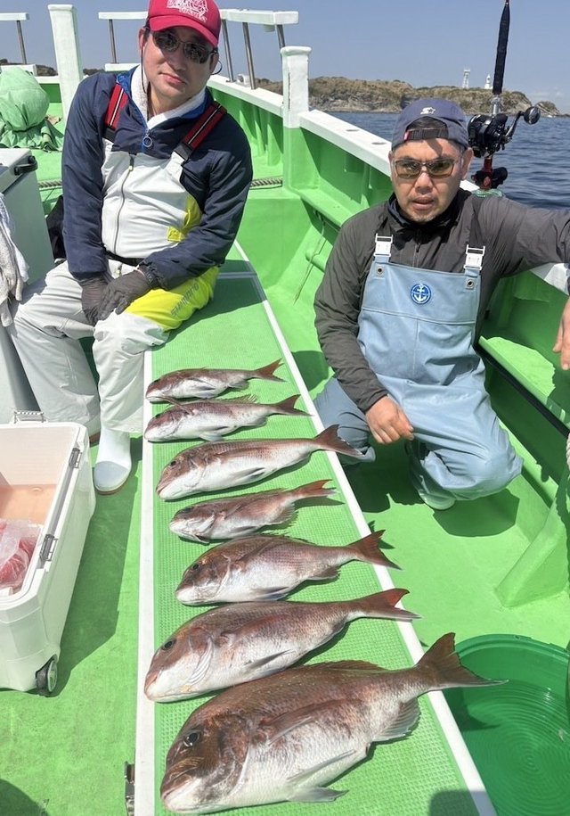 1.00kg 合計1匹 マダイ 0.40~0.70kg 1~4匹 クロダイ 1.00~1.20kg 合計2匹 ハナダイ 0.30~0.60kg 0~2匹 ホウボウ 26~38cm 0~2匹 カイワリ 22~30cm 2~10匹 アジ 25~35cm 0~3匹 ショゴ 46cm 合計1匹 本日もご乗船頂きありがとうございました^o^今日はLT五目で出船しました。朝からタイ狙い…朝イチから0.7キロのマダイget→続いて良いアタリ!デカそうなタイの引き込み…後10mくらいでバレちゃったみたいと…上がって来ると針折れてましたね(;;)残念!その後は少しサイズが小さいけどちょいちょい釣れてクロダイも混じりましたねー(^^)今日はカイワリがよく掛かりました。皆さんタイはgetしましたが釣れる方と釣れ無い方に少し差が出ましたね。タナ取りと弱いアタリ見逃さない様に…次回の五目もタイ釣れると思うので、チャレンジャーお待ちしてます♪明日はショートルアーです。
