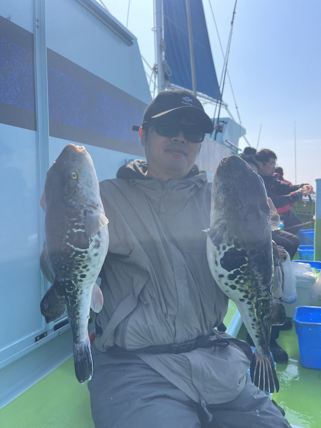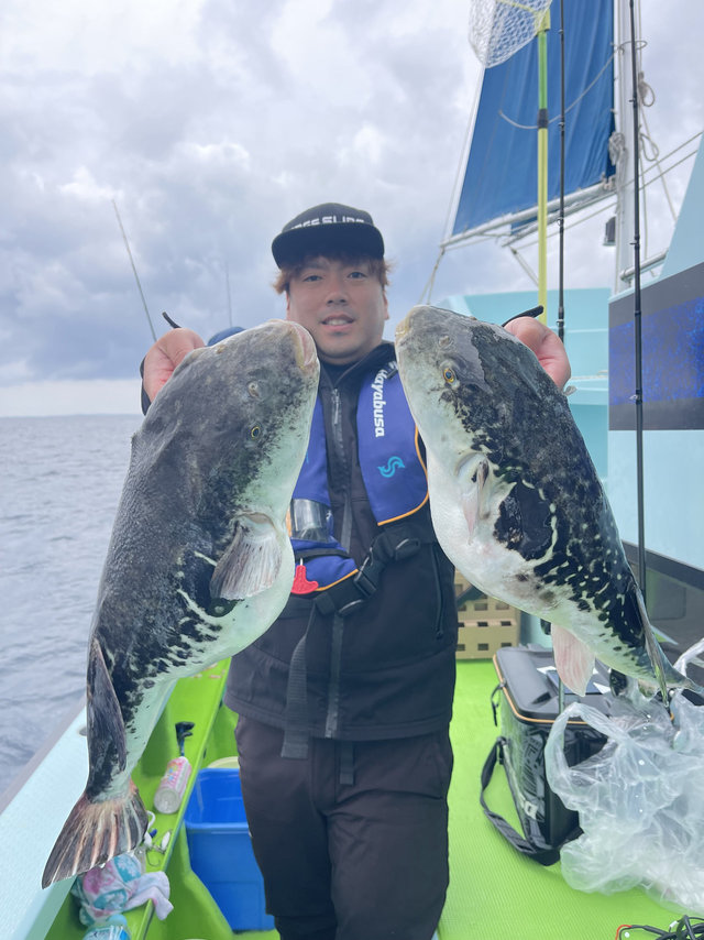 (トラフグ)最大42cm フグ フグ コモンフグ フグ船。15-42cm3-41匹 最大はトラフグ。 コモンフグ主体にショウサイフグとアカメフグ混じりでポツポツからたまぁに連発‼︎ あとは、ショウサイフグだけ。アカメフグだけ。場所によって色々でした。 初心者初挑戦の方多かったけど、全員ゲットできてアカメフグなしは3名だけでした。