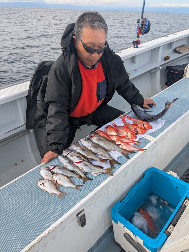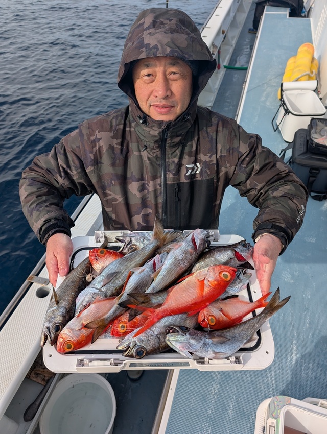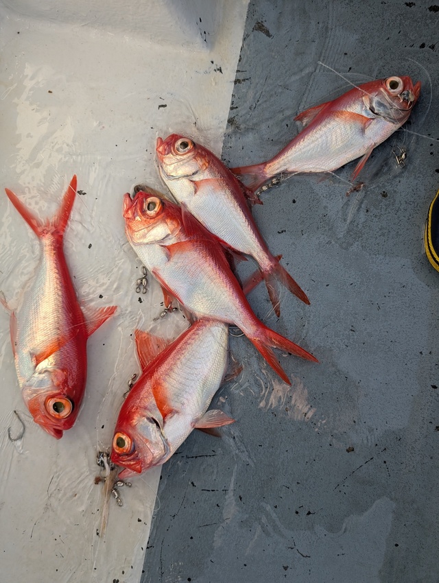 本日もご乗船ありがとうございました。 前半、クロムツのアタリよく、 皆さんお土産になりました! 途中から、キンメがよくなり トップ11尾でしたね。 ルアー: キンメ4-5尾、クロムツ2-2、シロムツ0-2尾。 明日は、大募集中です。 よろしくお願いします。