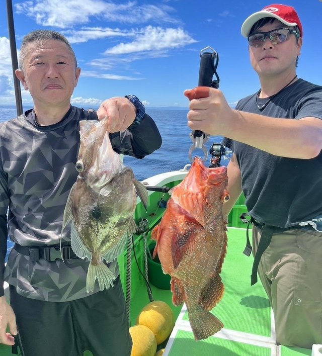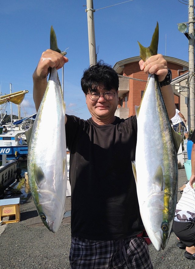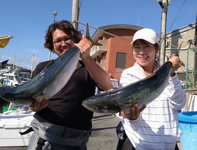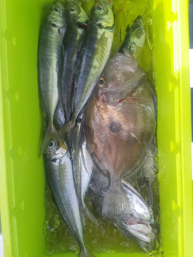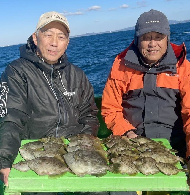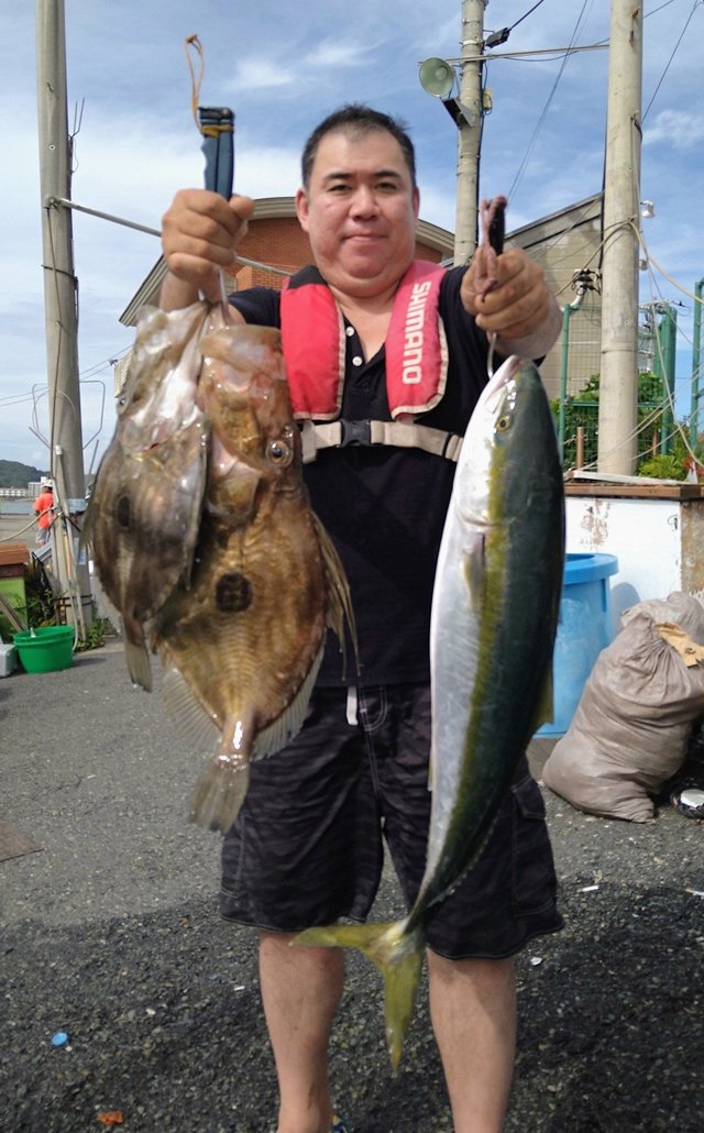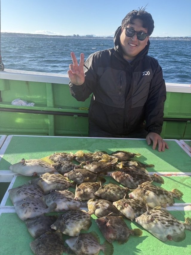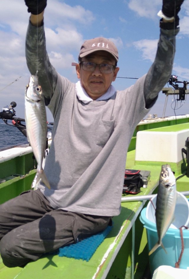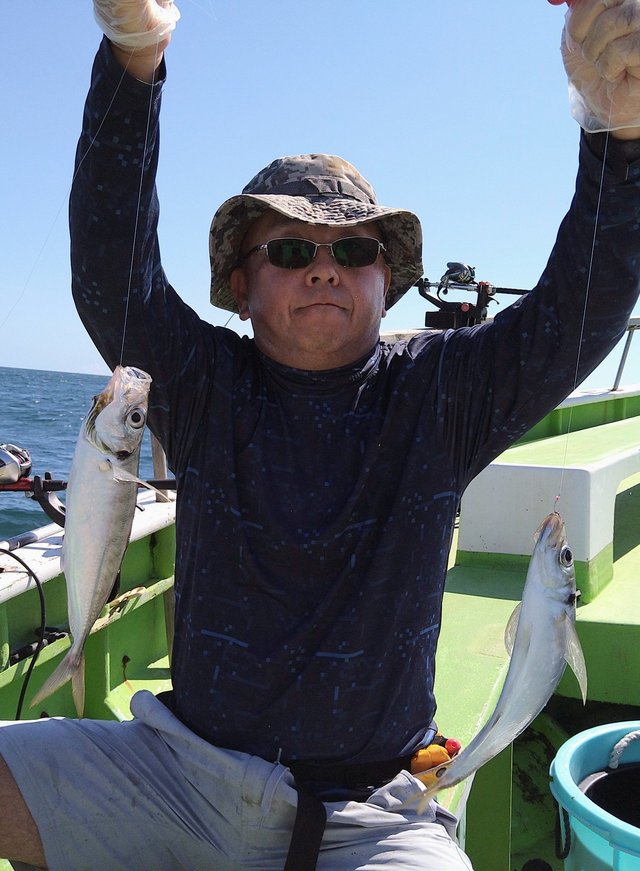 32~43cm 0~2匹 アジ 20~40cm 32~43匹 今日13日は朝から快晴で天気は文句無しの上、風は北の微風か、無風か、南の微風かって位に穏やかな風で、海はうねりが若干ある程度でしたから絶好の釣り日和で出船する事が出来ました。明日14日は、天気は晴れ、風は少し北がありそうですけど、問題無く出船出来ますので、釣行予定の方は安心してお出掛けになって下さい。アジ五目船、アマダイ五目船で出船します。(根魚五目船は最低出船人数に満たず休船になります。明後日15日は出船確定していますから宜しくお願い致します。) アジ五目船は何時もの根回りからスタートです。今日はうっすらと濁りが入り、一投目から中アジ主体ながら入れ食いモードにスイッチオン。朝一の盛り上がりで皆さんお土産ゲットです。その後更に浅場に移動して見ると、今度はデカアジが顔を出し始めました。まあ、これは反応動きまくりで長続きしませんでしたが、それでも、アチラコチラでこのサイズが出始めて来ましたから、これから楽しみしかありません。最後は深場で、やはりデカアジのプチ盛り上がりがあって納竿となりました。泳がせはマトウダイでしたが、ヒラメ、マハタ等も日並によっては捕まえられていますから、端物狙いも含め、明日からも期待してお出掛け下さい。
