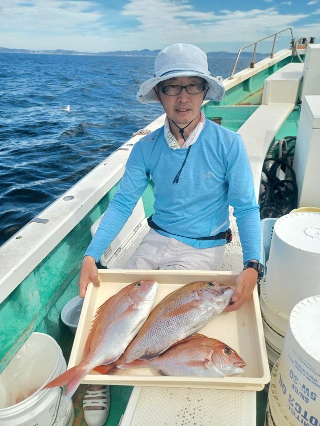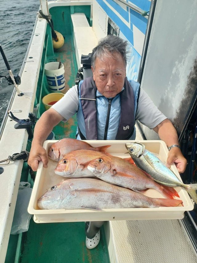 マダイ 0.50~2.50kg 0~2匹 イシダイ ヒラメ 58cm アジ サバ マダイ船。 潮色と流れ:濁りゆるい。 風向きと強さ:北東ほどほど→南弱い。 波高:0-0.5M。 別船アジの泳がせ釣り竿頭:将馬さん。 いつもご覧いただきありがとうございます! 真鯛トップ2枚!最大2.5kg! 最近は3kg近くある真鯛も釣れていて、魚群の入りも良くなってきていますね。 真鯛のヒット数は増えつつあるので本格的なノッコミシーズンに期待です! アジの泳がせ釣りにはヒラメ・マトウダイが食いつきました! ヒラメは58cmの良型! 明日も泳がせ狙いで行ってきます!