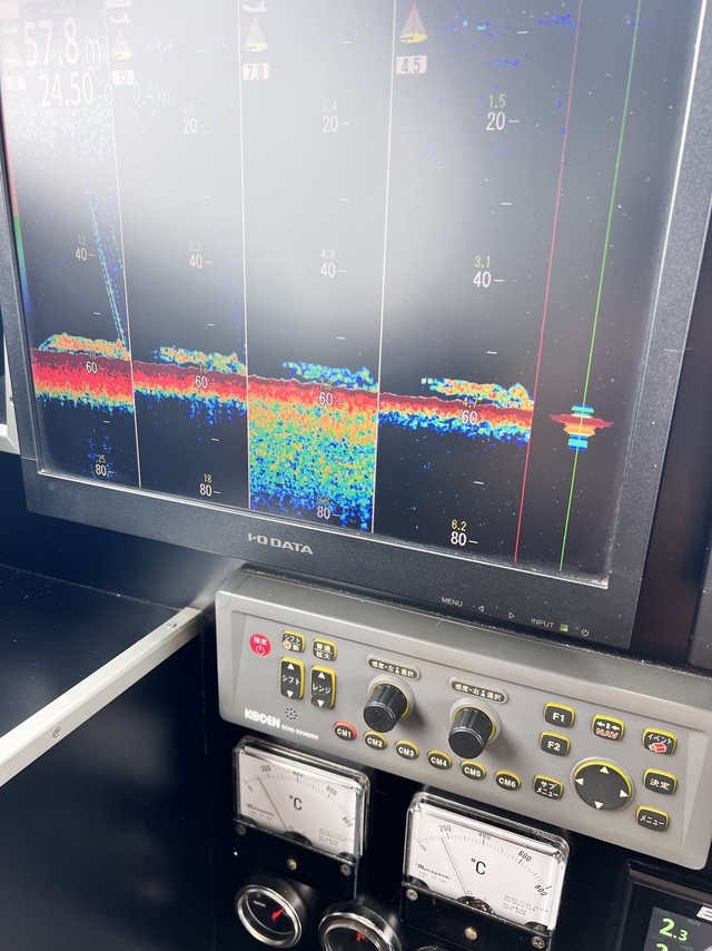 早上がり、、、 予想外の南西風強まり、11時半に納竿となりました。 ナギのうちにバシッと良い群れ見つけたかったのですが、今日は朝から反応が全然見つからず^^;何処隠れちゃったんだか、、、 小さい反応を仕方なくやるしかなかったので、全員巻きは無く片舷だけだったり後ろめの方だけだったりでバシッとやれませんでした。 ツ抜け出来ずの2番手8杯2名様と厳しい状況でした。
