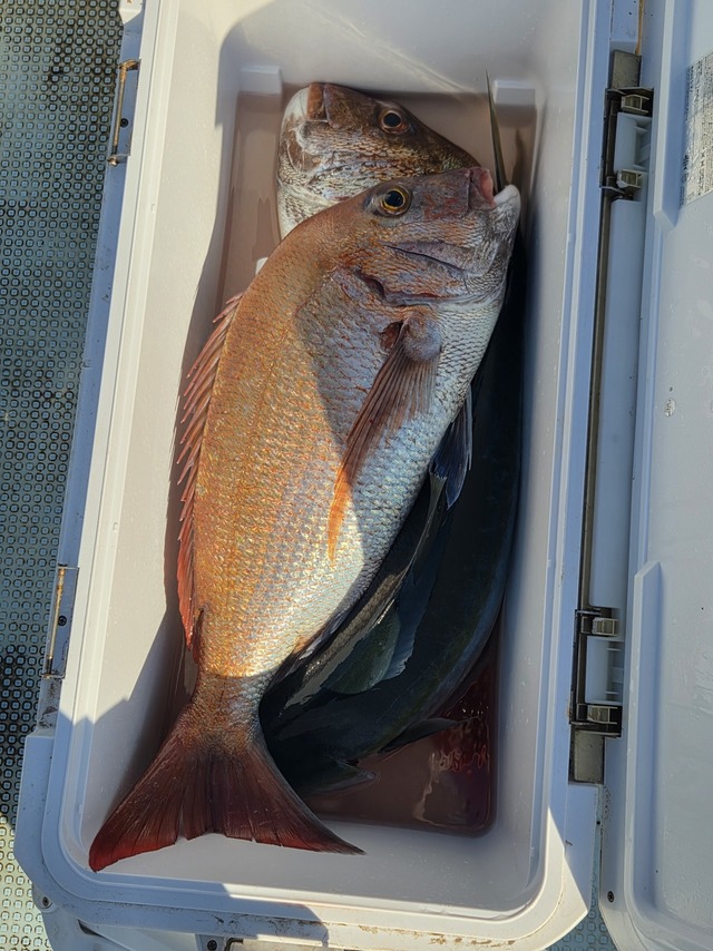 20~35cm 6~26匹 6時30分出船潮は澄み気味で流れは緩やかで、一日ボツボツ釣れました。バラシも多いようでしたが、大流しで釣れていました。泳がせで3キロのマダイ2枚とワラサも釣れました。竿頭は横浜市の杉山さん9名で一桁は1名だけです。プラ角11センチオモリ150号明日も出船しますので、予約お待ちしています。
