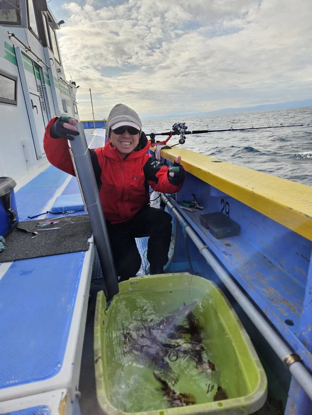 30~40cm 13~24匹 本日もナギ良く通常出船できました。 安定釣果の城ヶ島西沖ですが、小型サイズが多く、活性低めですと難易度マックス。 サイズが良いという江ノ島沖まで走ってみました。 江ノ島沖も真沖からさらに西の通称”オネ下”エボシ沖ですね。 小田原船が7隻、腰越船が1隻の船団に合流させてもらいました。 数が溜まるような派手さはありませんがポツリポツリと乗り、3~4杯掛けという場面もあり。 船中7名様で釣り平均的、13杯、13杯、14杯、17杯、17杯、18杯、24杯。 平均サイズは良く、パラソル級と言っても憎くないような大型も多数。 明日もご予約頂き出船確定も空席多数3名様、お連れ様募集です。 北風には強い江ノ島沖まで走りますよ、船長のモチベーションアップにご協力下さい。