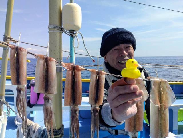 25~40cm 13~24匹 本日も通常出船できましたが、イカ場は大変に寂しいです。 城ヶ島西沖狙い、仕立船が1隻に本船とで2隻、後にもう1隻合流し3隻での操業。 朝一の投入から直ぐに型は見られ、どうにか順調。 空流しが続いてしまい小移動、昨日6杯掛けが出た付近を探ってみましたが不発。 再度城ヶ島西沖に戻りポツリポツリ。 自分がわかる範囲での沖イカ船は長井船が2隻、三浦船が1隻、湘南船が1隻に遠く沖合ですが勝山船が2隻でした。 本船はT丸から1名、H丸から1名おいで下さり船中5名様、13杯が2名、16杯、18杯、24杯。 イカ釣りは20年振り、日本海で数回だけというほぼ初心者の方も13杯上げてくれました。 しばらく見かけなかったヤリイカがあちこちにチラホラと気配あり、もう一山に期待しましょう。 明日10日(火)は出船見合せました。