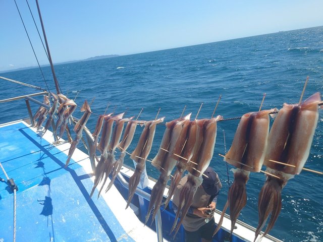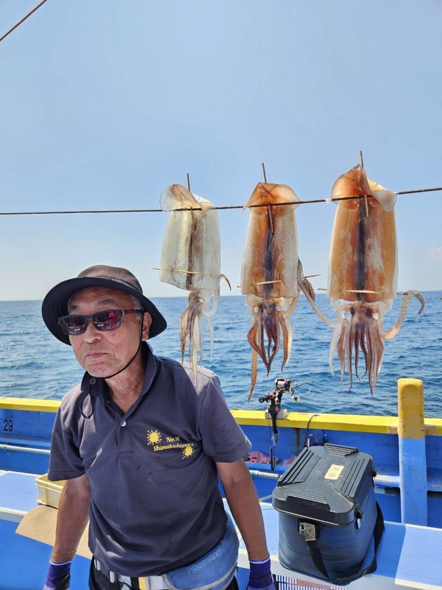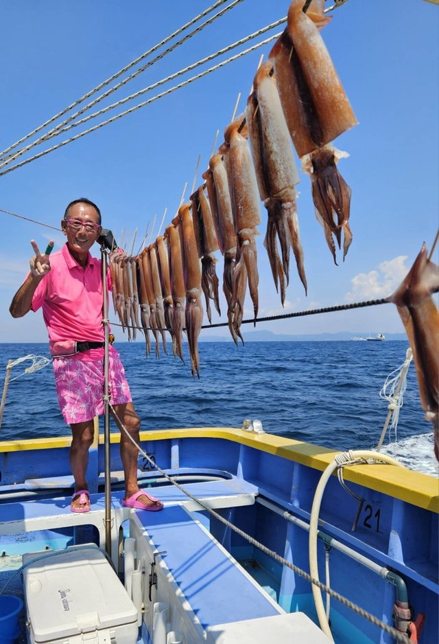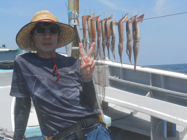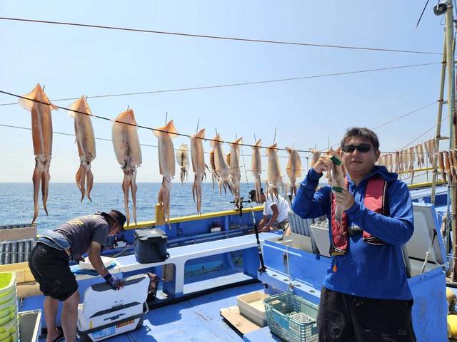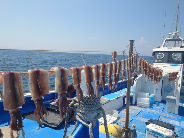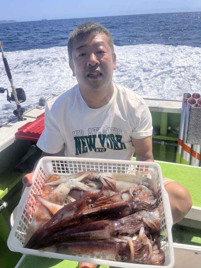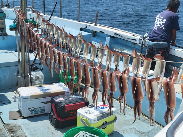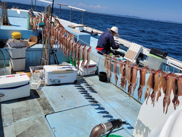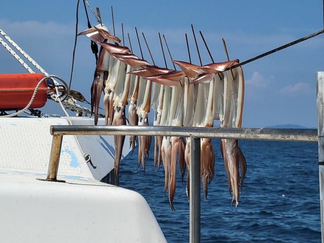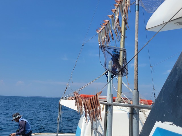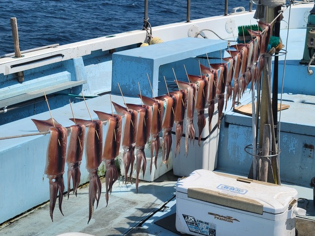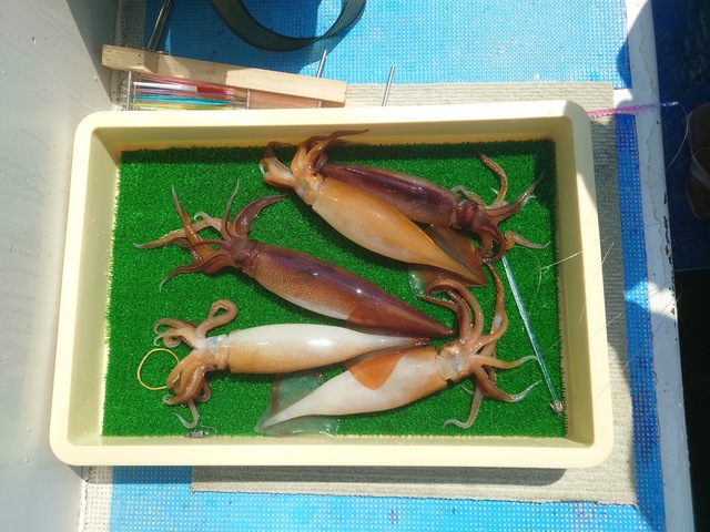 25~40cm 5~15匹 6時30分出船朝から洲崎沖を探して見たが、反応の移動が速いようで、深場でスルメイカが多くヤリイカが3割程度交じっています。浅場にヤリイカがいるようでしたが、上手くあたりませんでした。通常はヤリイカ狙いです。プラ角11センチ又は14センチオモリ150号明日も出船しますので、予約お待ちしています。