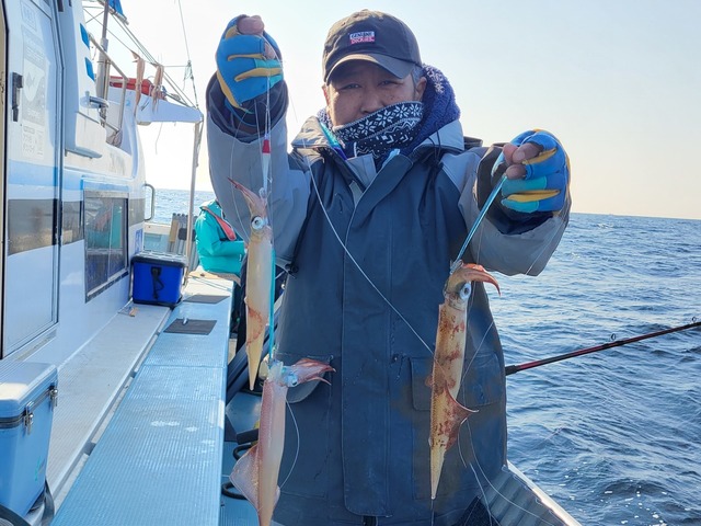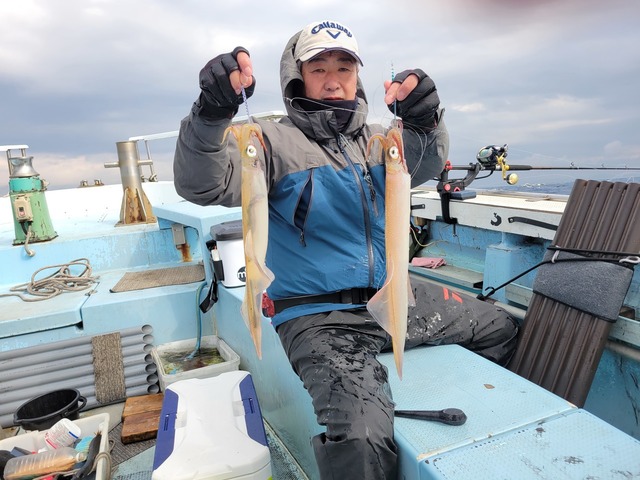 30~40cm 3~10匹 本日も通常出船できました。 北東強風予報にて予定通りに近場狙いは、長井からの乗合船、仕立船約10隻での操業。 潮流は緩く、大半がスルメでしたが終日通してポツリポツリと乗りました。 貸し竿を使用した方が竿頭。 寒い中お疲れさまでした。 明日も出船予定ですが15時現在ご予約1名様、もう1名のご予約で出船となります。