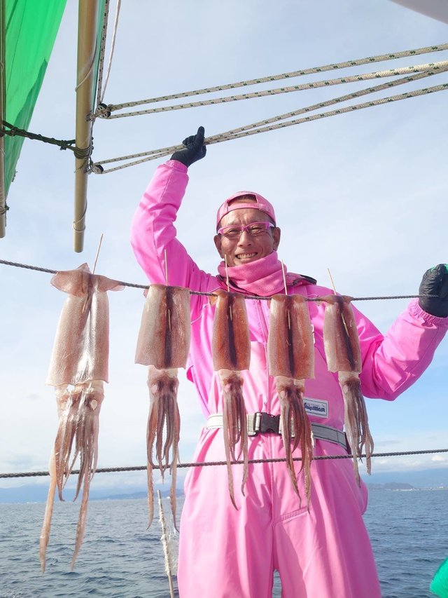 30~40cm 0~11匹 ヤリイカ 25~40cm 0~2匹 本日は北風強風予報、近場狙いで出船となりました。 近場と言いましてもイカ場は風影とはならず釣り難い強風。 魚やエサ交じりの反応は見えますが、中に混じるイカの群れは薄く型を見られるのが精一杯。 我慢していると突如スイッチが入り連釣になった事もありましたが、しぶとくしぶとく1杯つづ拾っていく感じでしたね。 次頭9杯、ボウズの方1名(大ドモ着座)出てしまいました。 明日はナギ予報、沖ノ瀬か洲崎沖を狙う予定でいますが速潮は必至です。 手返し重視、そして少しでも潮流の影響を受け難くするのにツノ数は少なく(5~8本程度)お願いします。 最近のトレンドは釣果を伸ばす上級者の方ほど少ないですよ。 オモリは150号使用、羽根付きなど異形タイプの使用はお控え下さい。
