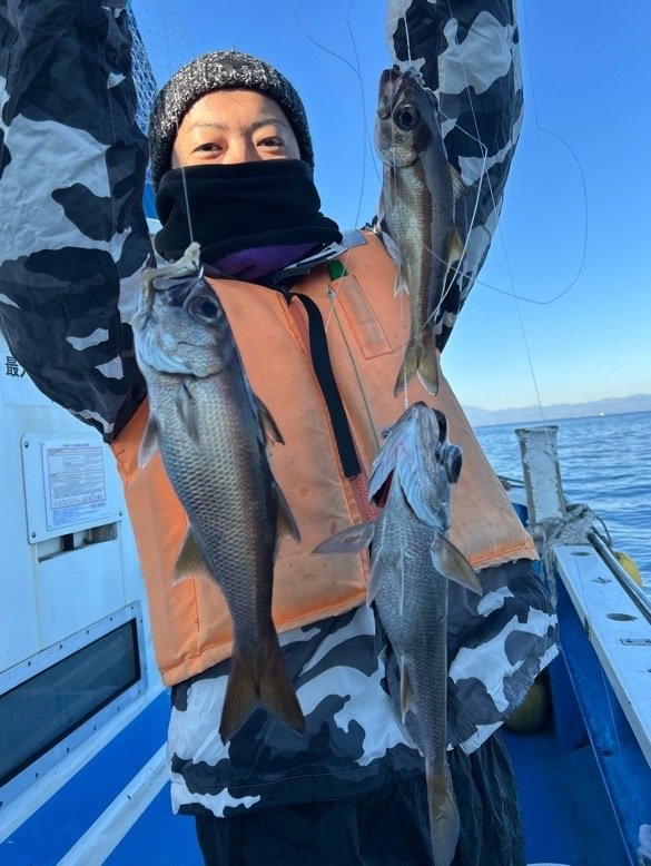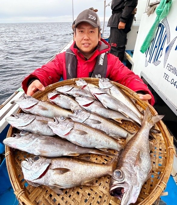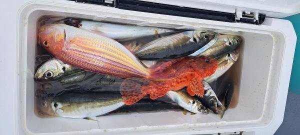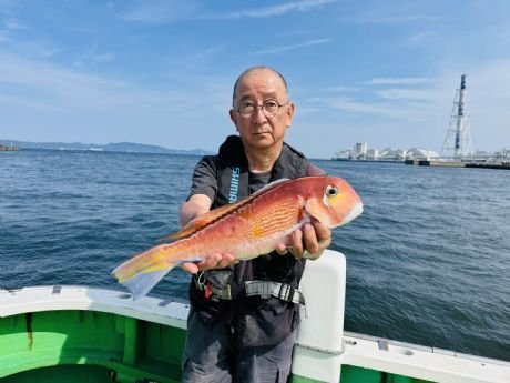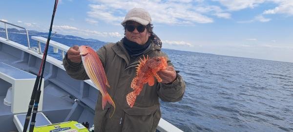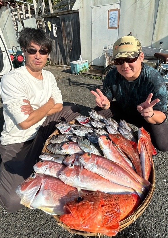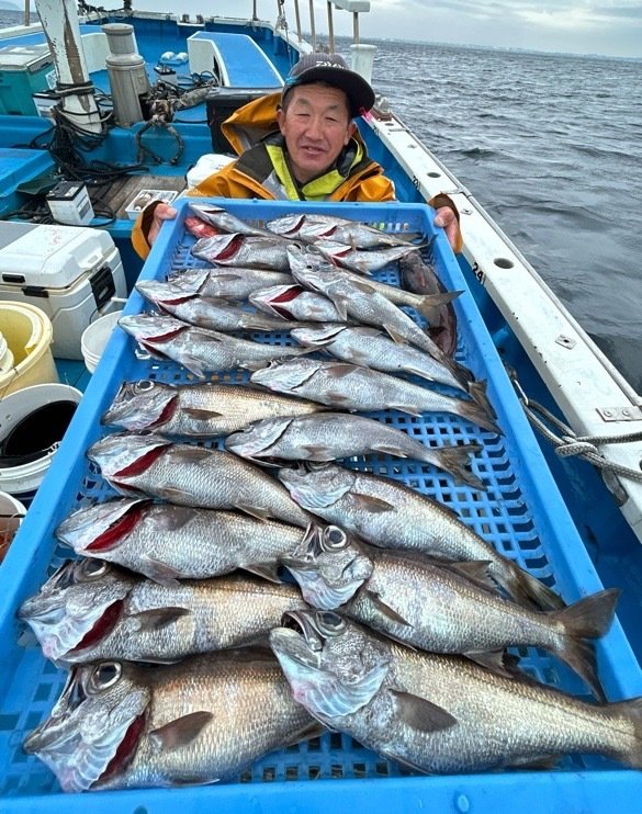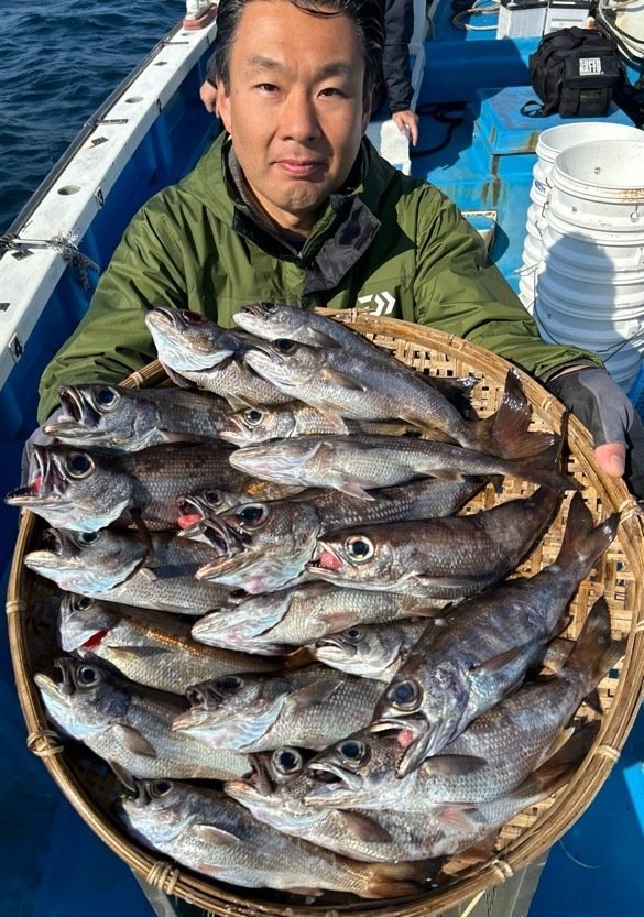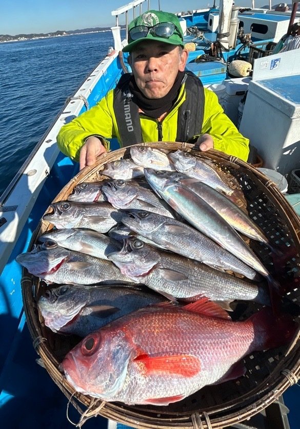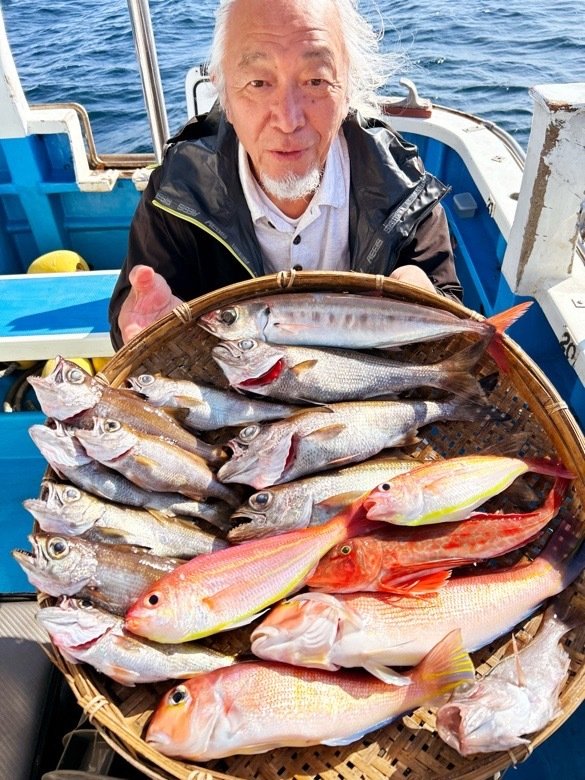 アマダイ 23~42cm 3~18匹 オニカサゴ カンコ アカイサキ アマダイ船。剣崎沖を転々と狙い、日並良く海上穏やかで良い凪でした。 1日を通して適度に潮が流れて、前半にかけて澄んだ明るい潮の時間帯に誘いがハマった方は入れ食いモードでアマダイ連発し船中ポチポチと釣れ続き、後半は濁った潮が来てから2枚潮で渋くなりましたが、サイズは中型主体に良型&大型42cm混じりで終日ポツリポツリと顔見れました。 トップはダントツの18尾♪2番手7尾が2名、3番手6尾、裾3尾で全員ゲット出来ました! 潮次第でデカアマのチャンス有るので今後に期待しましょう(^^♪