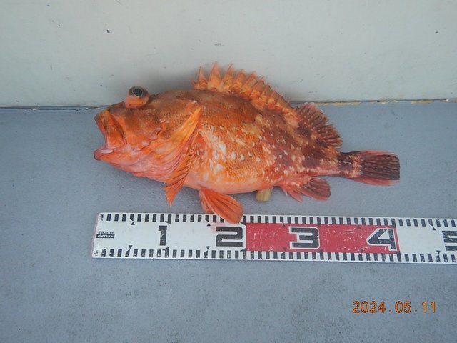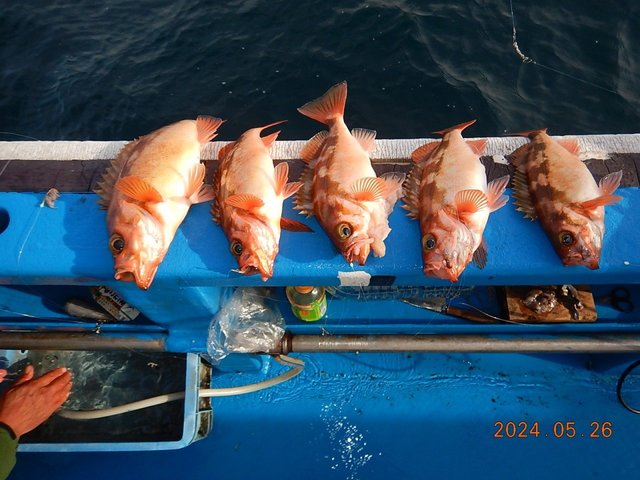 1~10匹 オキメバル 20~50匹 マハタ 合計1匹 マゾイ 0~2匹 ウッカリカサゴ 合計4匹 ヒメ キジハタ 佐渡延長便沖メバル釣りに出船。 凪は良いが潮が流れず、船が回ってやりにくい。 そして反応は低い。 予報と違い曇り空で気温も上昇せず時間が経っても肌寒い。 数箇所回っているうちに全員ヒットするポイントにあたったが型は中型が多かった。11時頃よりマハタのいそうなポイントまで行き1時間半ほどやってみたが、やはり今日は活性が低く、この時期に鈴なりになる小メバルも姿が少ない。ベイトも低かったためマハタのアタリは程遠かった。魚の形を見ると例年今頃は小メバルでも卵を抱いて太っているものがいるはずだがまだ、そんな個体はそんなに見かけなかった。少し沖メバルは時期が遅れているのかな~..........???最後、もう一度大きめの沖メバルを探しに移動。終了間際に再びヒット。ここでは大きめのホッケが多数混ざった。卵を抱いているような感じの太り方でした。ホッケの卵は、個体によって色が違い見た目は少し、気持ち悪いけど煮て食べるとハタハタの卵のようで美味です。 こんな外道も大歓迎ですね・・・。今日はマハタを期待していただけに、少し物足りなさの残る一日でした。又、リベンジお願いします。
