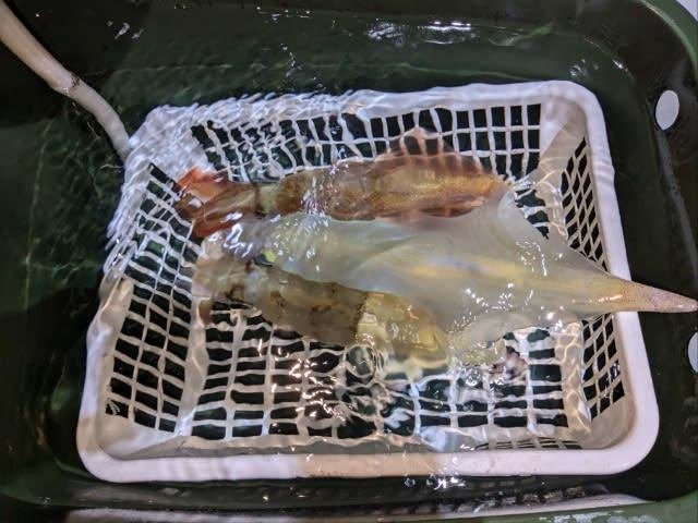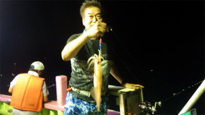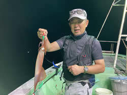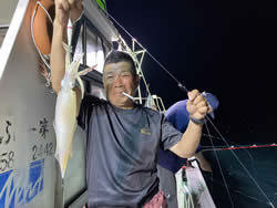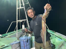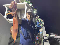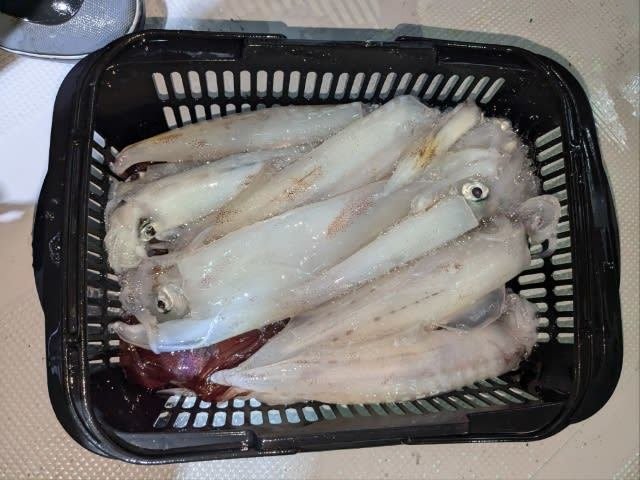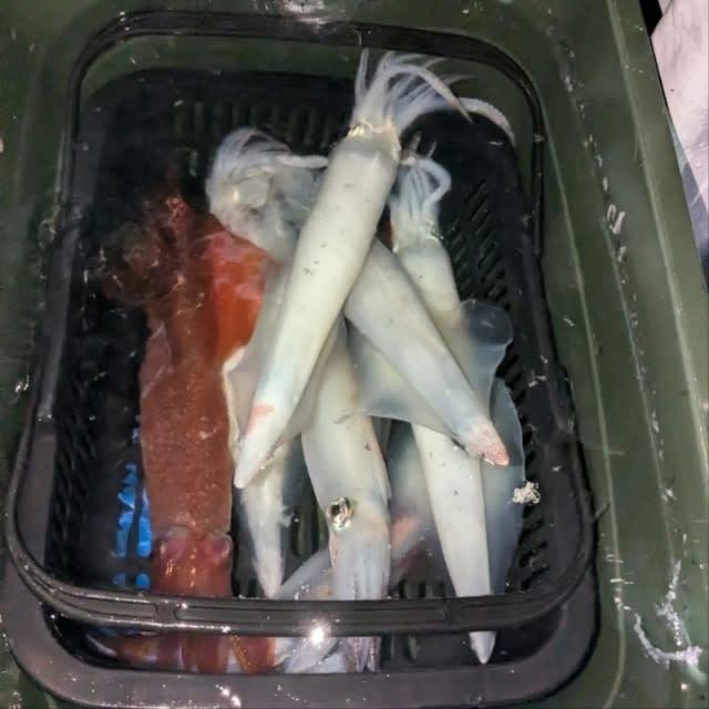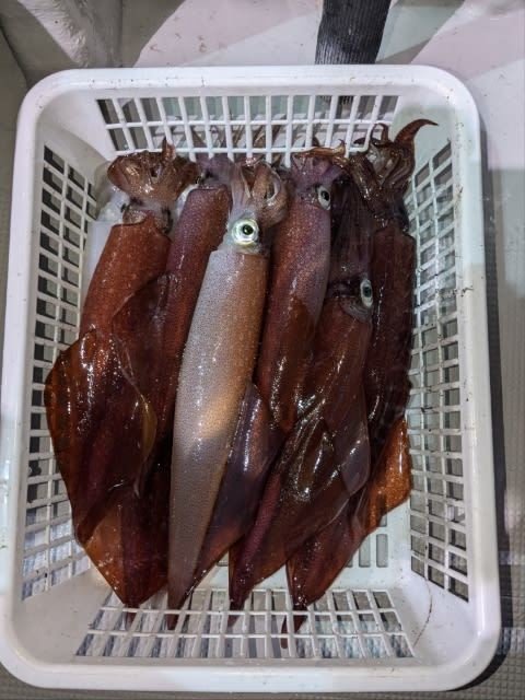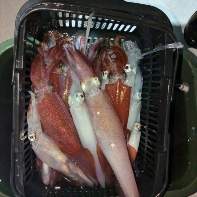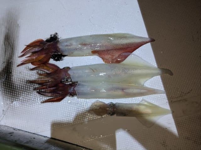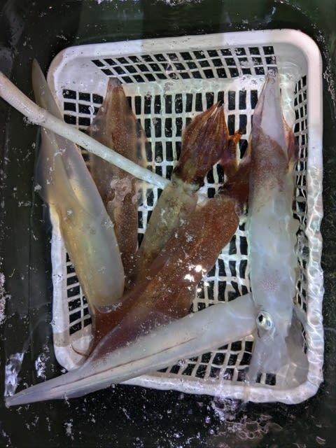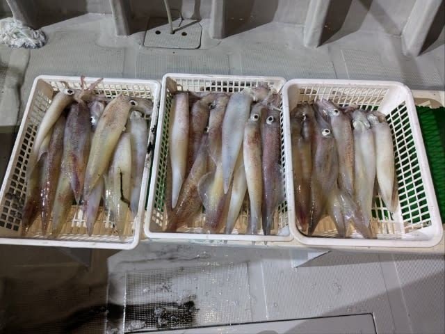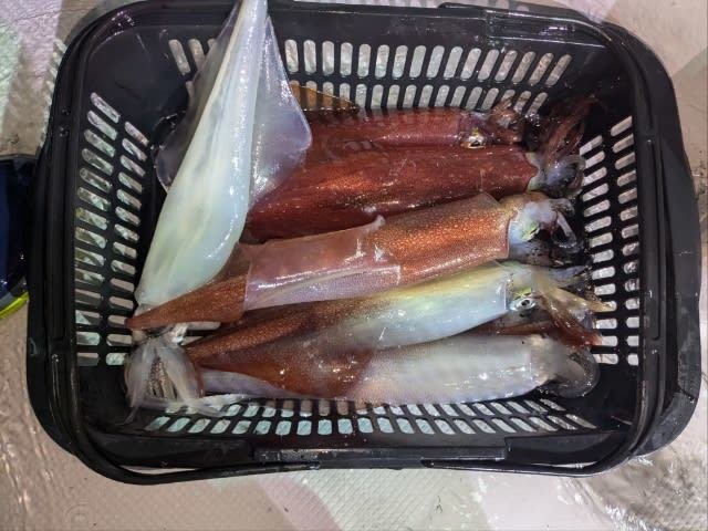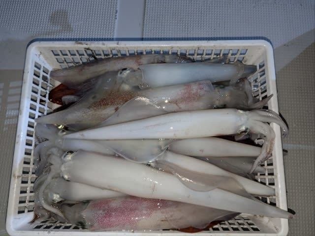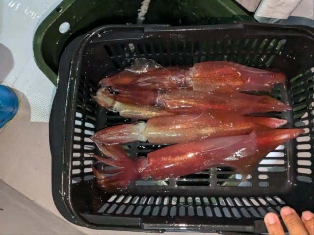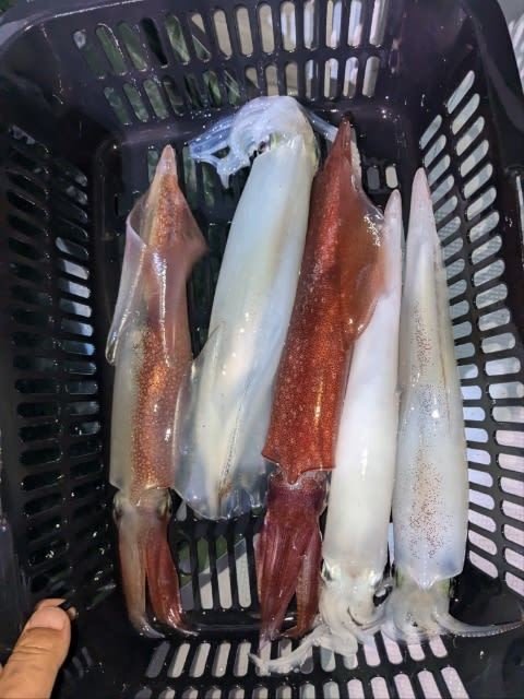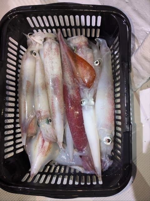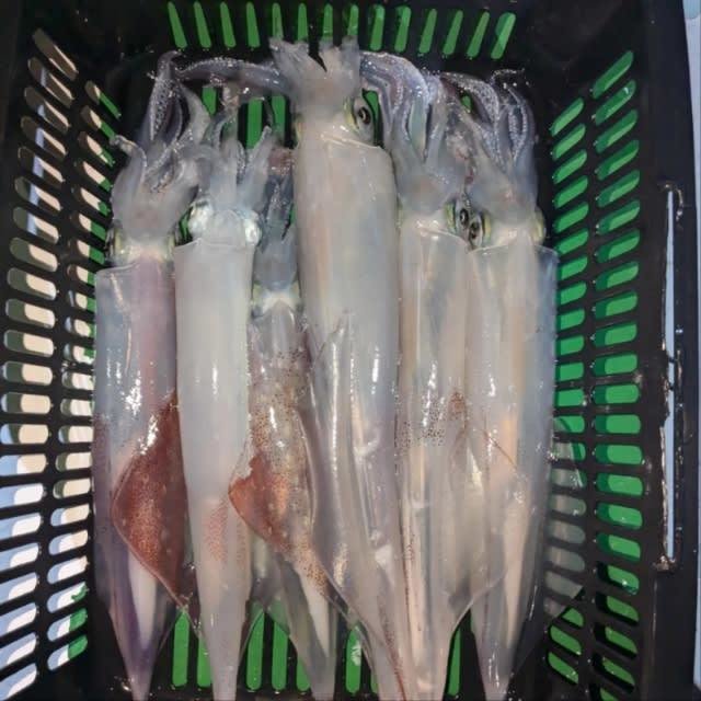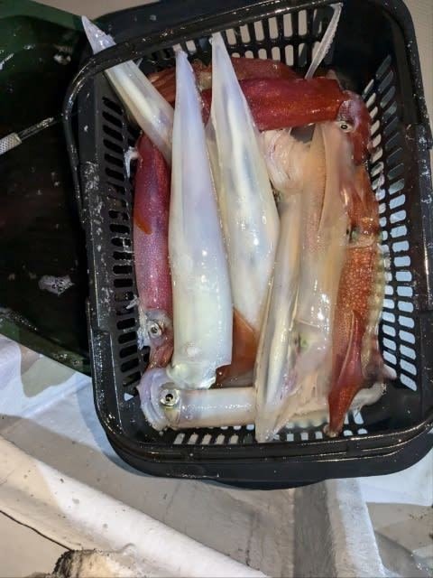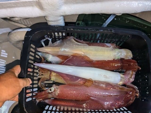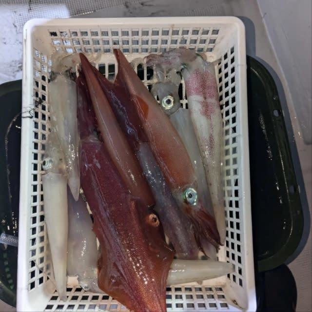 (ケンサキイカ)10~30cm 3~9匹 3便。 アカイカ/胴長10〜30cm/3〜9杯、 明日は予報悪く中止となります