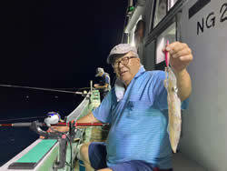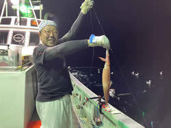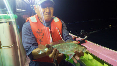 (ケンサキイカ)合計10匹 サバ 竿頭50匹 アジ 合計10匹 スルメイカ 夜便アジ&アカイカ釣り。前回よりもさらに深い、100m水深でやってみた。最初に40cmサイズのアジが見えたが後が続かず、大サバで落ちていかない。 2~3本針で丁度良い感じです。針多いとすぐ仕掛け絡みがおきるので枝間0.8~1m程にしないとサバが大きいので上げにくい。 アジは海底すれすれでわずかに見えたがせいぜい船中10匹程度。一人だけアカイカをやっていたがメスだけ10杯とスルメイカが1杯でした。 あまりに潮が悪くシーアンカーの浮きも右に見えたり左に見えたり忙しく、ラインもまっすぐになったと思ったらすぐまたなびいたりでどうなっているのか見当もつかない。 間違いなく水温は高いので、やはり川水が出てほしい所です。 サバが好きな方には、大型なので楽しいと思います。中型をリリースして大型だけ持って帰れば丁度良いかと思う。 現在、サバのお腹にはイワシがぎっちりと入っているため、お腹の劣化が速いです。釣れたらすぐに腹だけ開いて、胃袋を抜いた方がよさそうです。 塩焼でもおいしいですが、味噌煮や味噌漬け、味醂干しや締めサバに適したサイズです。 あまりのサバの勢いに疲れ果て30分早く帰港でした。