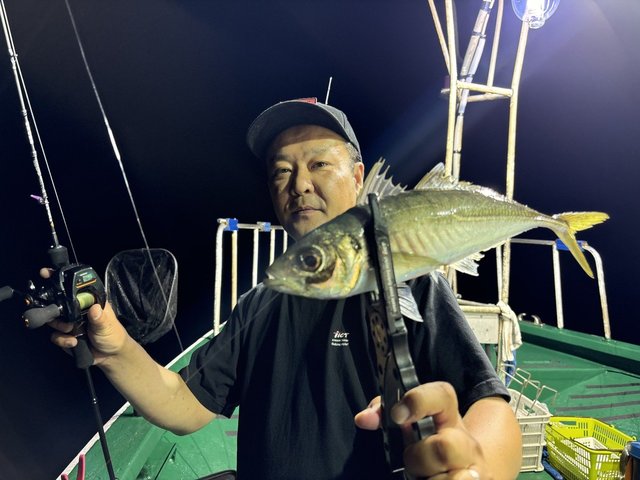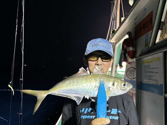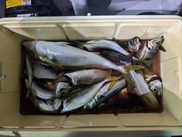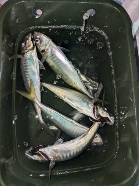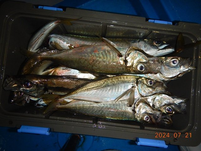 (ケンサキイカ)25~35cm 0~2匹 アジ 25~35cm 竿頭15匹 サバ 夜船。夜船アカイカも今日は不調。前半はサバばかりでしたがアジが後半になりやっと釣れ始め良い人で15匹ほどでした♪