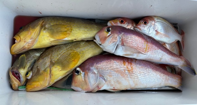 チダイ レンコダイ マアジ ツバス カイワリ キハタ マサバ 泰丸の釣果。 午前便五目釣り。 今日の午前便は、チャーター五目釣りで出船しました。どのポイントも魚探では反応が小さく、見極めが難しかったですが、ツバスや大型のマアジがメインに釣れていましたね。 天候も良く、楽しい釣りになって良かったです。