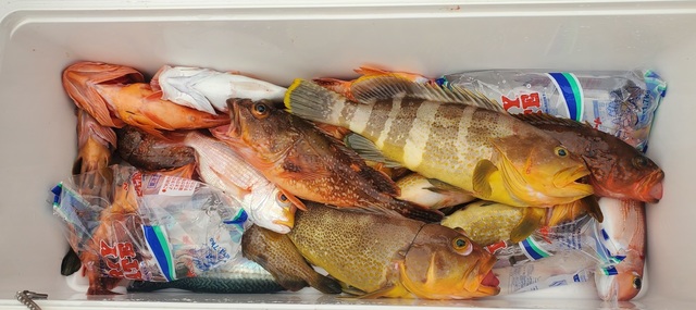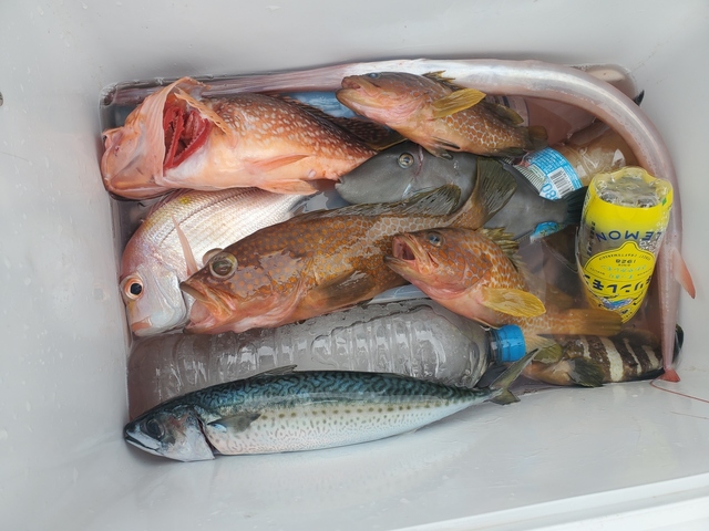 マダイ メジロ 60~65cm 合計7匹 サワラ 70~75cm 合計5匹 アコウ 30~45cm 合計2匹 サバ 40~43cm ツバス 【ジギング・タイラバ便】今日は朝のうちまだ波が残っているのでゆっくりめに出たためアオリは狙いませんでした。魚釣れました!!!マダイ、メジロ、サワラ、デカアコウ、アオハタ、大サバなどなどでクーラー満タンになってました!!!