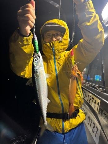 (ケンサキイカ)スルメ サバ 半夜マイカ便です。マイカよりスルメが多かったです。 お疲れ様でした。ありがとうございました。