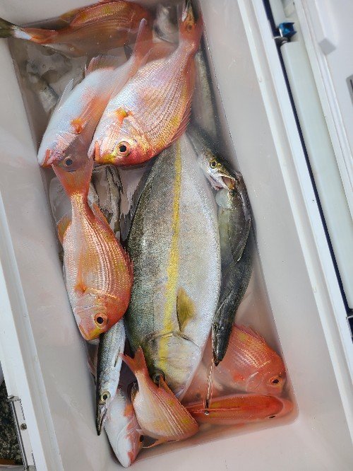 (カンパチ)アジ ワカシ マダイ 合計3匹 午後便。12時発!手ぶらフィッシング。 今日はアジもポツポツヒット! ラッキーはマダイ!何と3枚!これは超ラッキーですね。手ぶらフィッシングも続投中!