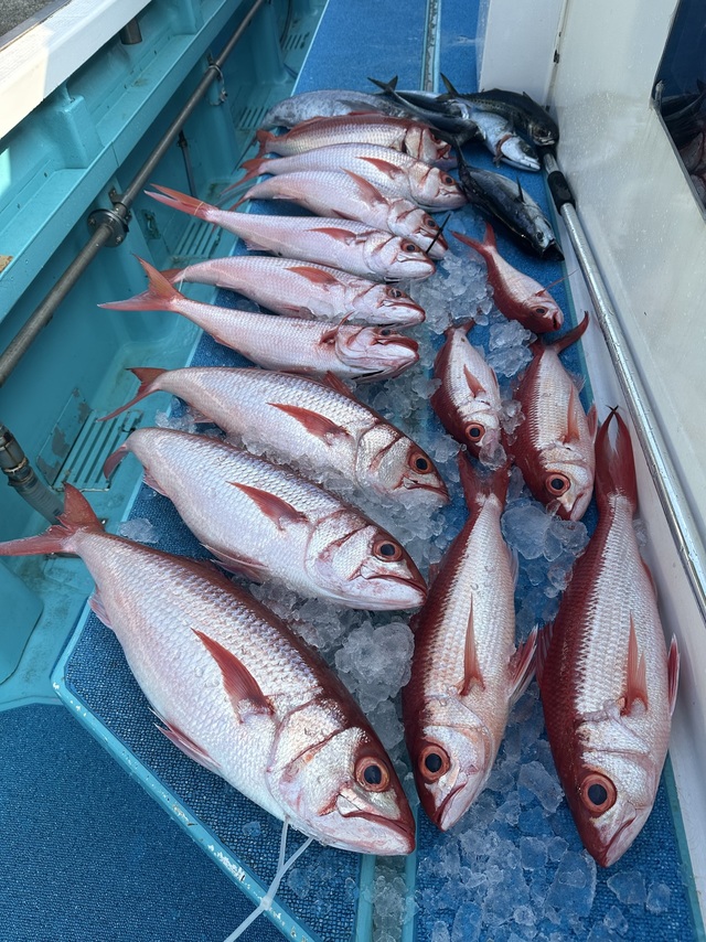(ハマダイ)オニカサゴ 竿頭11匹 ムツ カンコ レンコ アヤメ メバル オニカサゴに出船しました。 昨日よりはうねりも和らぎ、凪でしたが、潮が悪く難しい1日でしたが、オニカサゴはトップ11本、他ムツ、オナガダイ、カンコ、レンコ、アヤメ、メバル等が飽きずに釣れました~。 船酔いしてしまった方もおりましたが、お土産程度は釣れました。 お客様、暑い中頑張って頂き、ありがとうございました。 オニカサゴチャレンジャー募集中です スルメイカも今なら釣れております~。 大募集中でーす。