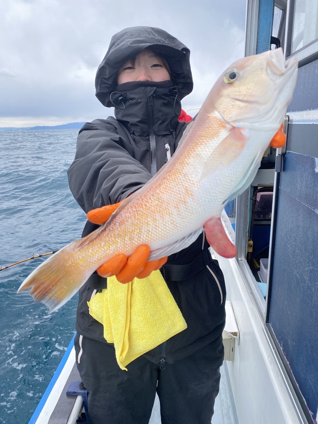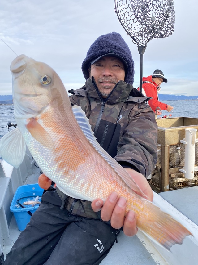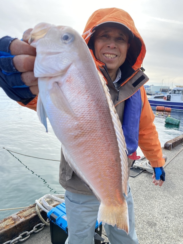 (アカアマダイ)20~35cm 1~3匹 シロアマダイ 35cm 0~1匹 アカラサン イトヨリ マダイ 最大0.80kg 潮流れが悪く食い渋い。納竿間際に小型ですが35cmシロアマダイ1尾上がりました。アカラサ、イトヨリ、真鯛0.8キロ混じりました。波の高さ0.5m。午前船。