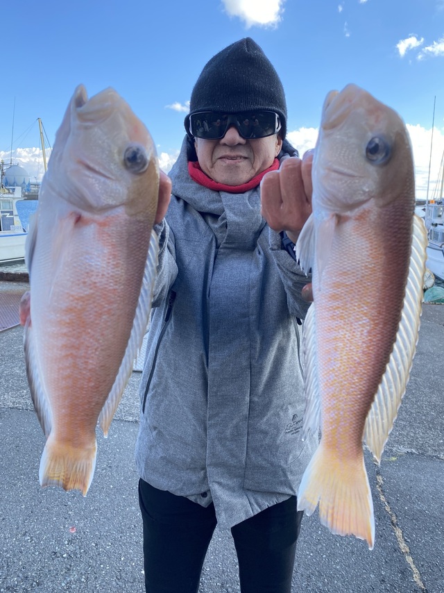 (アカアマダイ)23~38cm 4~8匹 潮流れず苦戦! これといった良い流しもなく、終始拾い釣りのような感じでした。良型は出ませんでしたが、中型をお土産分は確保できました。小型のリリースありがとうございます。 アマダイ(赤白混合) 23~38cm 4~8匹 イトヨリ、レンコ、ソコイトヨリ、カイワリ、カサゴ、アオハタ、マハタ、ヒメなど 明日(5日)も凪良くアマダイ出船! 現在2名と空き多く、チャレンジャー大募集!!