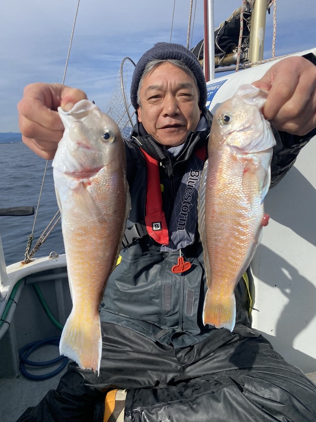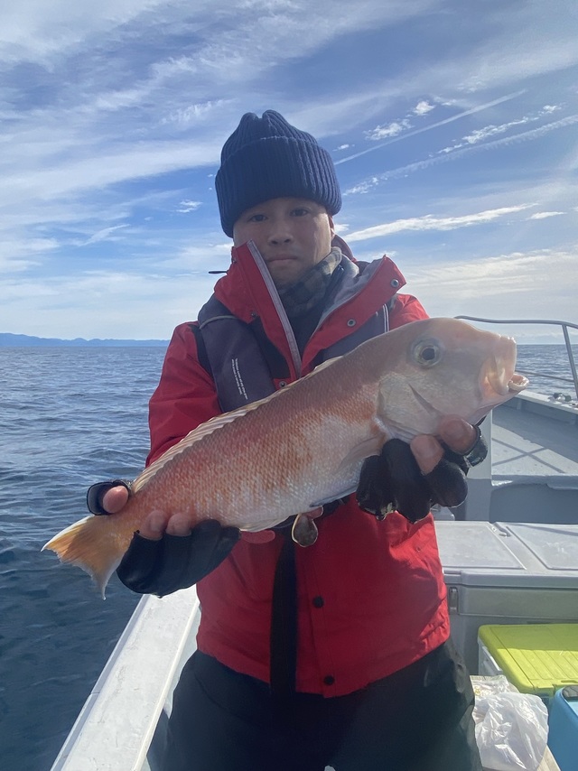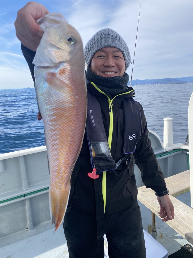 (アカアマダイ)平均37cm 合計2匹 マダイ 0.60~0.80kg 合計3匹 オオモンハタ 1.00kg 0~1匹 カイワリ サバフグ コマセ五目乗合船。 マダイ0.6〜0.8K船中3枚。アマダイ37cm2本。 オオモンハタ1K1本。カイワリ、サバフグ。今年もご乗船ありがとうございました。本年は、昨日が最終出船でした^^釣り納めになんとか大本命マダイGET!良型アマダイにハタも上がってぼちぼちの釣果。マダイの釣果安定してます。年明けは、元旦から出船です♪来年もご予約お待ちしてます^^。