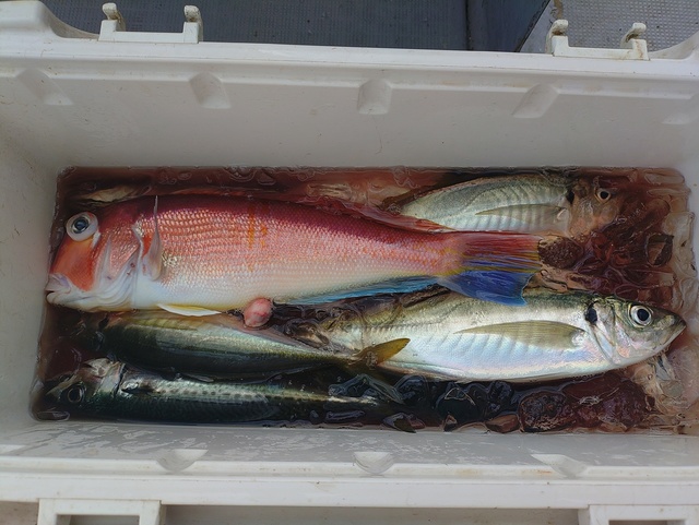 (アカアマダイ)28~32cm 合計2匹 イトヨリ マアジ ゴマサバ コマセ五目乗合船。アマダイ32〜28cm船中2匹・良型イトヨリ少々・ マアジ、ゴマサバ。 先日、大風で釣行断念したお客様のリベンジマッチです。 ぽつりぽつりの拾い釣りでしたが、中盤にスペシャルゲストでアマダイが浮上。 良い型のマアジも混ざって、五目釣りの様相でした。