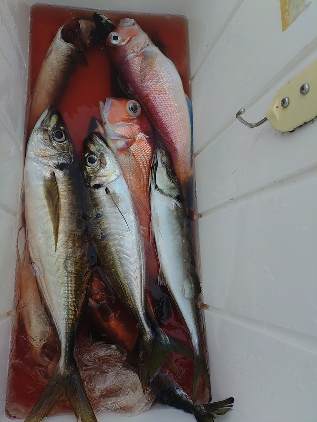 (アカアマダイ)サバ アジ 午前マダイ五目船。朝方アジの喰い良かったですが、ソウダ増えて数伸びず。 他アマダイ・サバ。 一時まとまった雨降りびっくりしました。