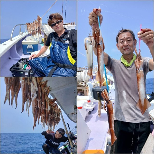 石廊崎のスルメイカに出船しました。前半はポツポツ、後半尻つぼみでしたが、慣れていない方も楽しんで頂け、良かったです。先輩船長達は、沖干しカーテンが見事に出来ておりました。お客様、暑い中お疲れ様でした~。 クーラーの画像は沖漬の汁が漏れ、何だか分からない状況ですが、40~50杯作れたとの事です(笑)