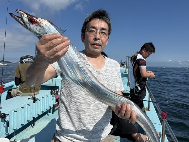 (シロサバフグ)サバ アジ タチウオ 竿頭13匹 ブリ 最大85cm 合計2匹 行って来ました。 タチウオが良い感じだね。 ほいほいとまではいかなかったけど 指5までがイイ感じで遊んでくれたよ。 去年もその前もそうだったけど はじめはデカいのが多くて、そのうちにチビが増えてきて アタリは多くなるけどさきにチビが食って デカいのが遠くなる サイズ狙いならはやめにおいでよ! アオモノチャレンジも何度かやって ババババンと4本ヒットさせて2本キャッチ ジギングデビューのレンタル君も ブリ仕留めてくれたよ。 ありがとうございました! ブリ85センチまで2本・ タチウオ指5まで13匹・ アジ・さばふぐ・サバ。