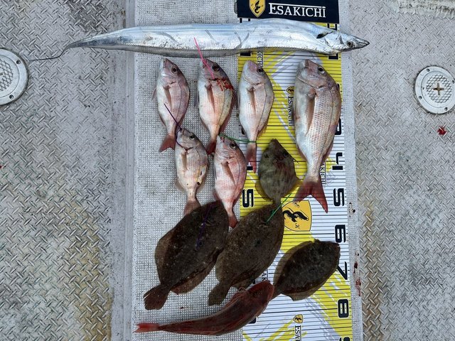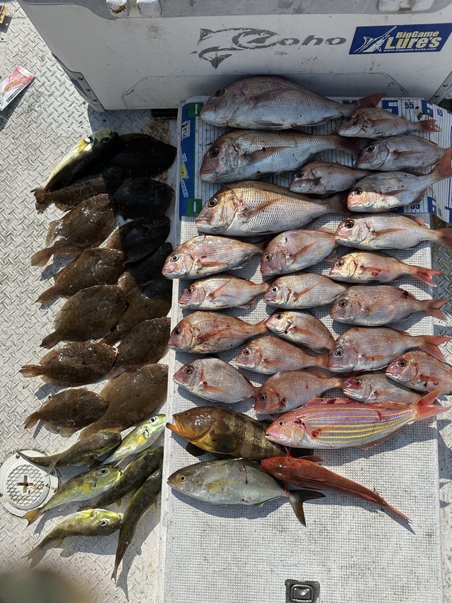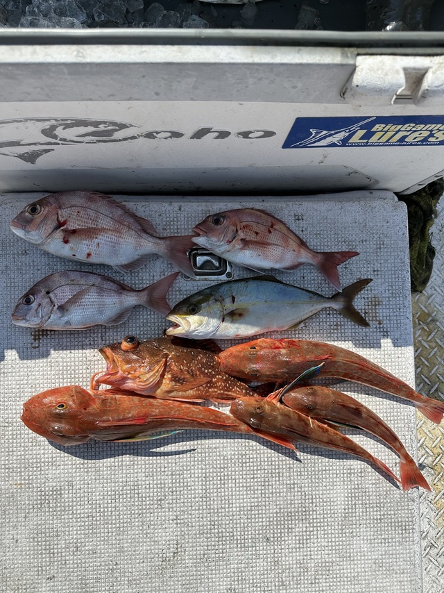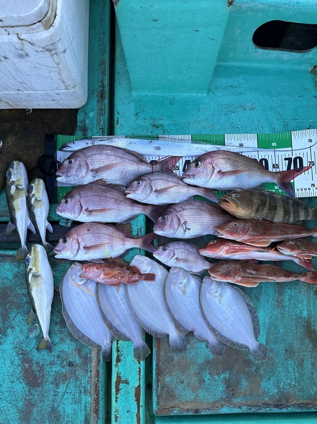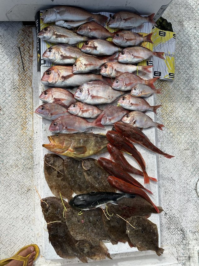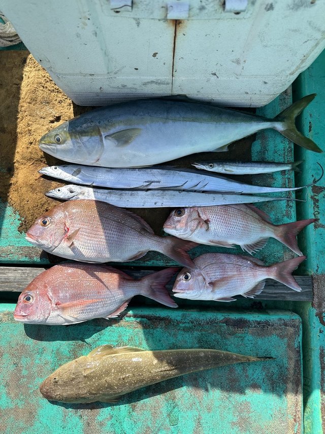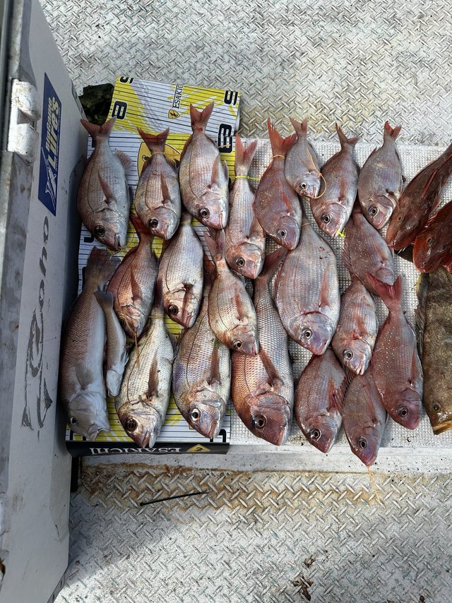 30~40cm 合計4匹 オコゼ マアジ カサゴ ゴマサバ ソマカツオ ハマチ イサキ 5時40分〜12時までタテ釣りで大物狙いです。1号船です。 ポイント石鏡沖 仕掛太サビキの7本針、ハリス8号オモリ60号エサ小魚 いなべ市の小久保氏らの乗り合い マダイ30〜40cm4匹 その他オコゼ、マアジ、カサゴ、ゴマサバ、ソマカツオ、小ハマチ、イサキ 東の風が涼しく吹いて波もありました。 ベイト反応は多くありましたがサビキに付きが悪いようでした。 ジアイにタイのアタリが多くあったように思いましたね。