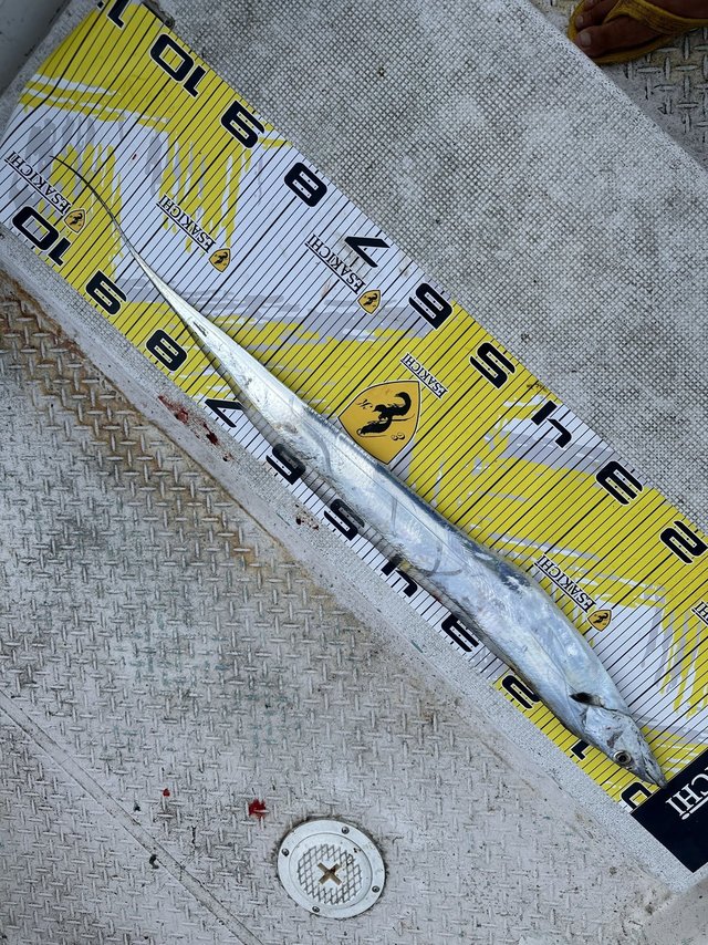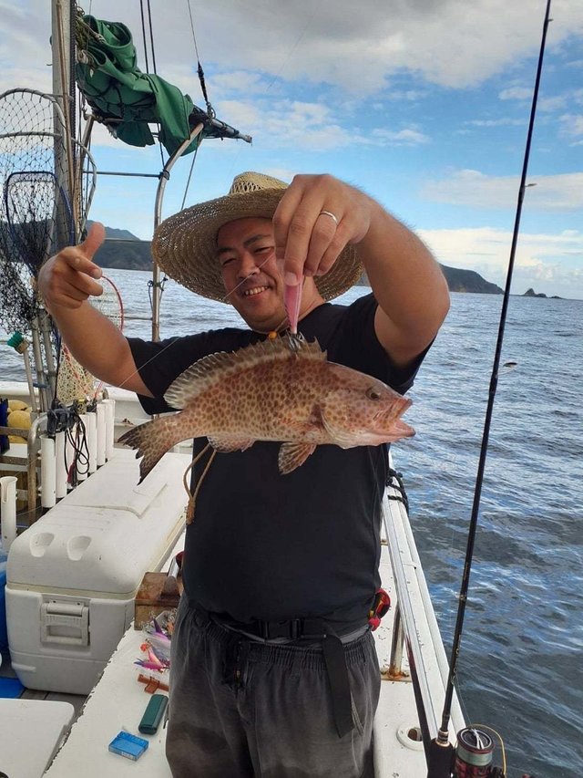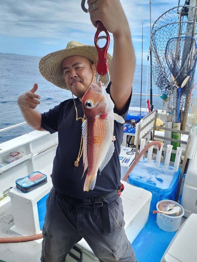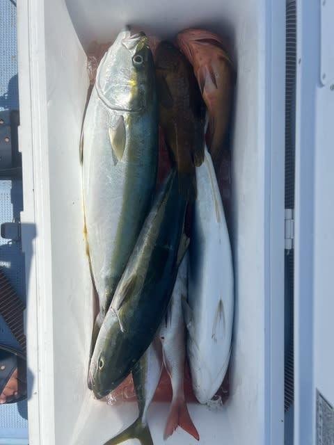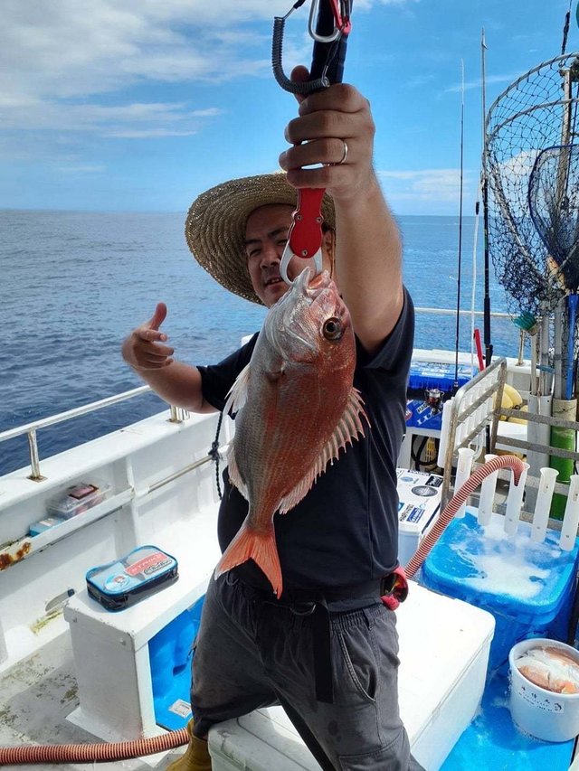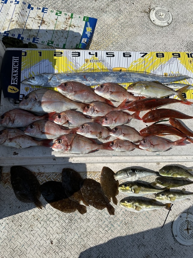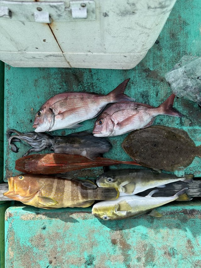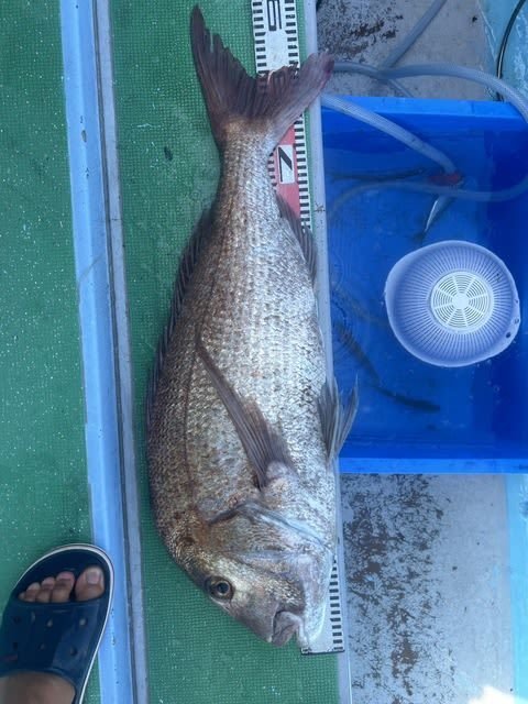 30~40cm 合計4匹 オコゼ マアジ カサゴ ゴマサバ ソマカツオ ハマチ イサキ 5時40分〜12時までタテ釣りで大物狙いです。1号船です。 ポイント石鏡沖 仕掛太サビキの7本針、ハリス8号オモリ60号エサ小魚 いなべ市の小久保氏らの乗り合い マダイ30〜40cm4匹 その他オコゼ、マアジ、カサゴ、ゴマサバ、ソマカツオ、小ハマチ、イサキ 東の風が涼しく吹いて波もありました。 ベイト反応は多くありましたがサビキに付きが悪いようでした。 ジアイにタイのアタリが多くあったように思いましたね。