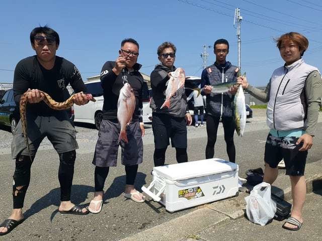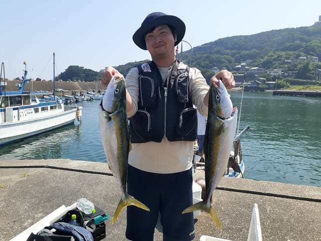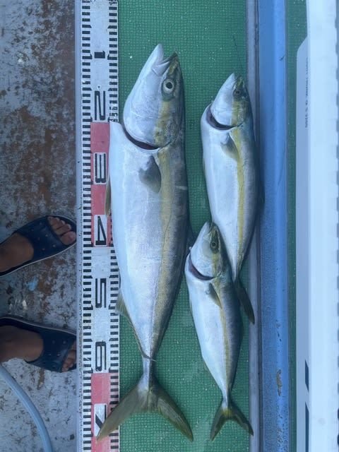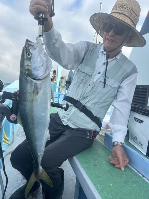 最大45cm ニベ 最大60cm アジ イサキ カマス サバ ムツ ツバス 5時50分〜12時までタテ釣りで大物狙いです。1号船です。 ポイント石鏡沖 仕掛太サビキの7本針、ハリス8号オモリ60号エサ小魚 奈良の森中氏ら3名の釣果 マダイ45cm ニベ60cm その他アジ、イサキ、カマス、小サバ、ムツ、ツバス 南の風が涼しく吹いて涼しく釣りができました。 沖からのうねり、波もありましたね。 ベイトは多くありましたが、大物のアタリが少なく釣果もイマイ