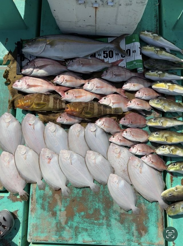 44~52cm 合計2匹 ヒラメ 最大58cm オオモンハタ カサゴ アカハタ イサキ アジ 6:00〜12:00までタテ釣りです。2号船です。 ポイント石鏡沖 仕掛け太サビキの7本針、ハリス8号オモリ60号 マダイ44〜52㎝2枚 ヒラメ58㎝ その他、オオモンハタ、カサゴ、アカハタ、イサキ、アジ ベイト反応も小さく中々針に付きずらかったですね、色々まわりながらたまに当たりがあり顔見るぐらいでした