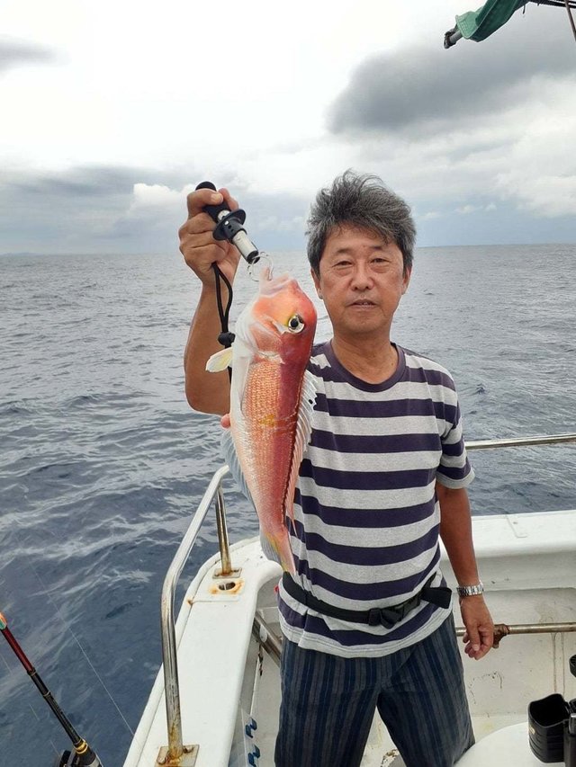 (マダイ)25~36cm 合計8匹 アカイカ 0.50kg 合計1匹 7月30日タイラバ便 本日、途中、津波警報発令! ひきかえし、お客様、高台へ避難して頂き、船は、沖出しそなえましたが、 警報解除ならず、お客様安全第一に そのまま残念ながら、終了して頂きました。それまでの少しの釣果写真に なります。