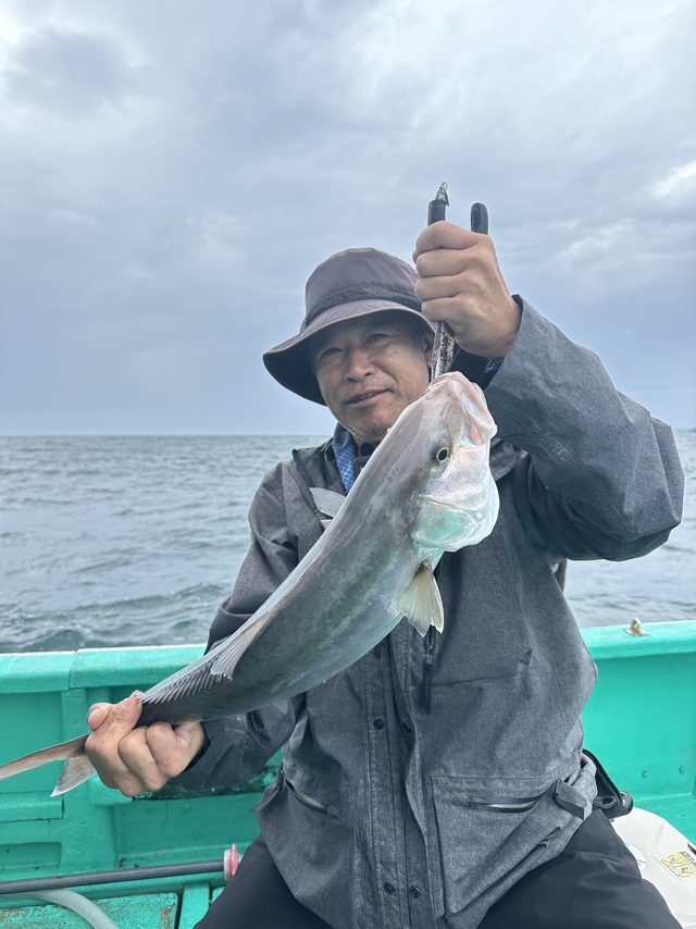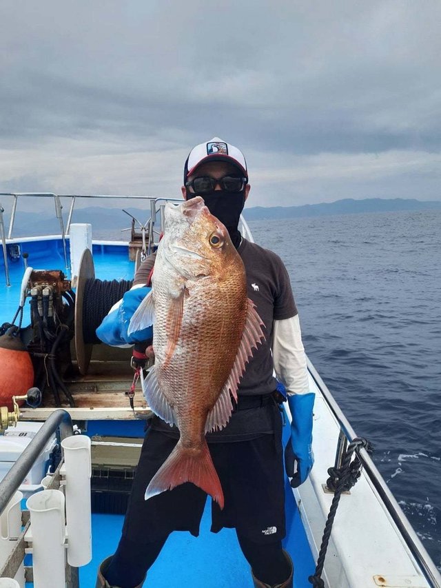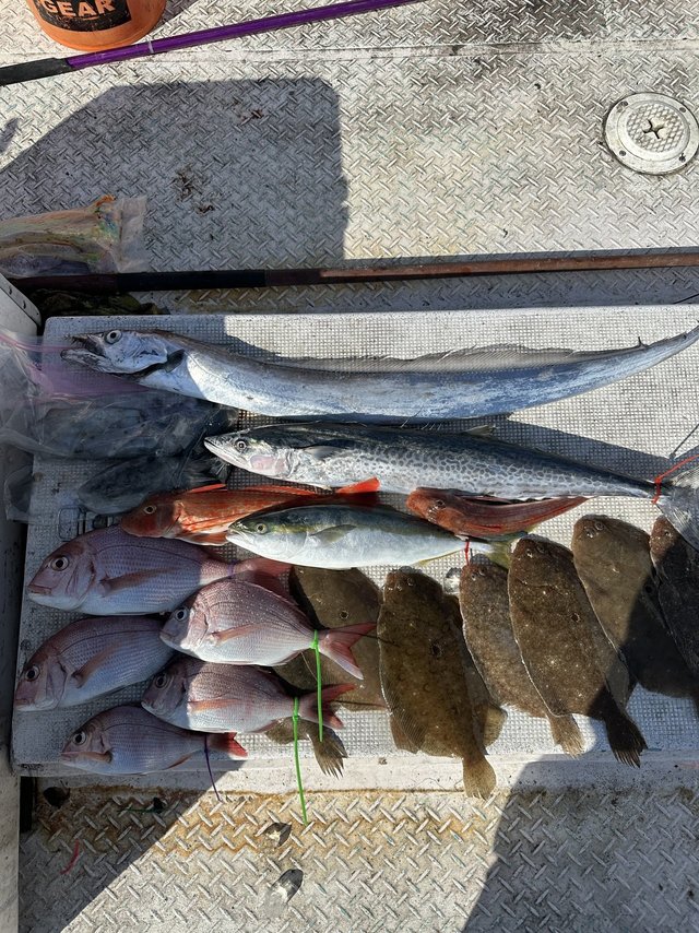 1号船午前便タテ釣り。 5時50分〜11時45分までタテ釣りで大物狙いです。 北西の風が涼しく吹いていてうねり、波もありました。 小サバ、イワシ、小アジのベイト反応はたくさんあり釣りやすかったですね。 大物のアタリは少ない感じでしたが、バラシもあってタイの食いは良かったようです。