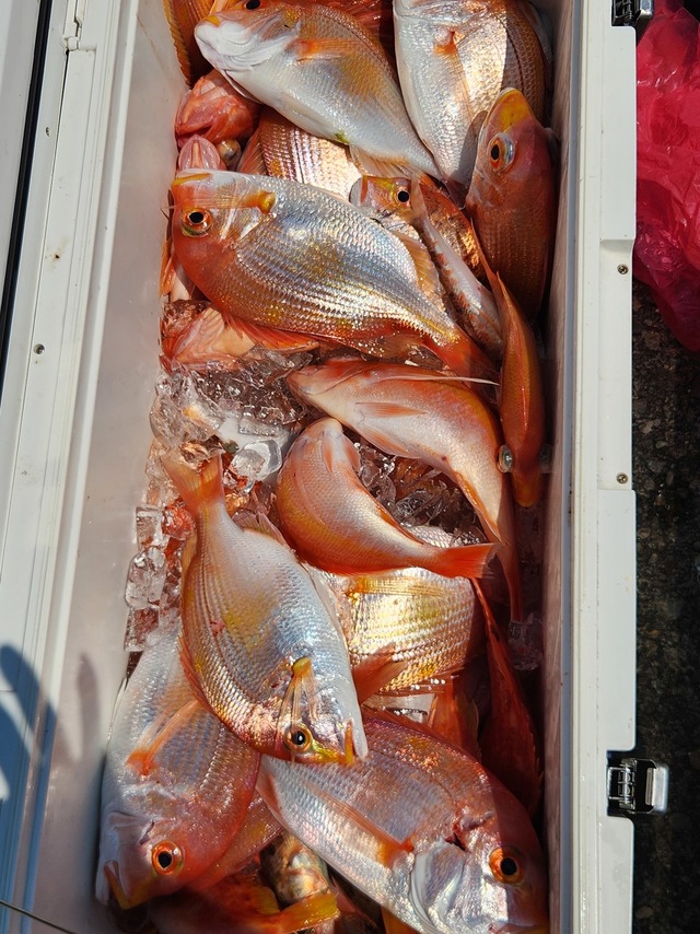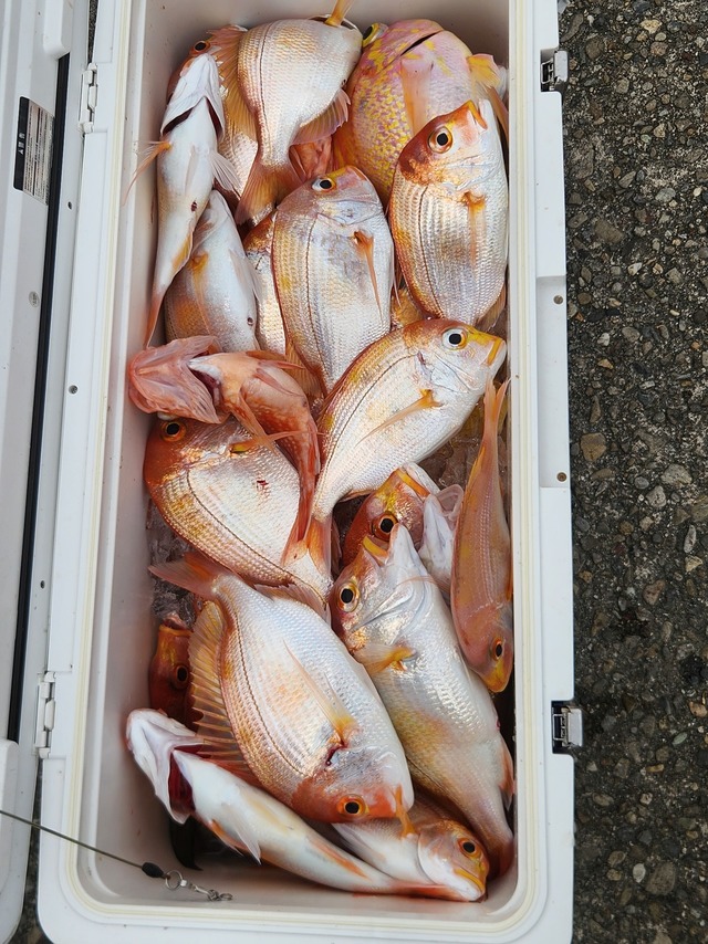 (アカアマダイ)アオリイカ 風は少々強めにですが! 今日はエギング→アマラバにて出船。 朝一エギングから! 釣果どうでしょう? ウォーミングアップのはずが シャクリ倒して貰いましたが。 この一杯だけでした。 いか絶不調です。 そうそうに切り上げ 続きましてアマラバヘ。 甘鯛はどうでしょう? アマラバはどうにかなりました。 人数の割にはちょっとて感じでしたが 今日もショートバイトが多く なかなか針掛かりせず先週と同じ バラシ多発でした〜。 当たりカラーはバラバラで何に 反応して居るのか分かりません。 ベイトはエビ食べてるんですけどね。 合わせても無反応。 明日も頑張って探してみます!! 本日の御乗船ありがとうございます。 またのご利用お待ちしております!