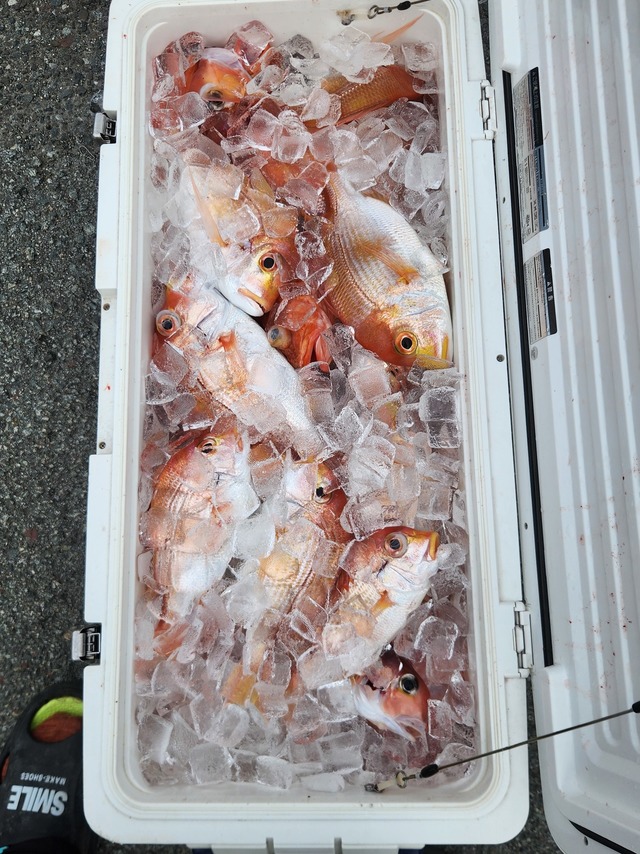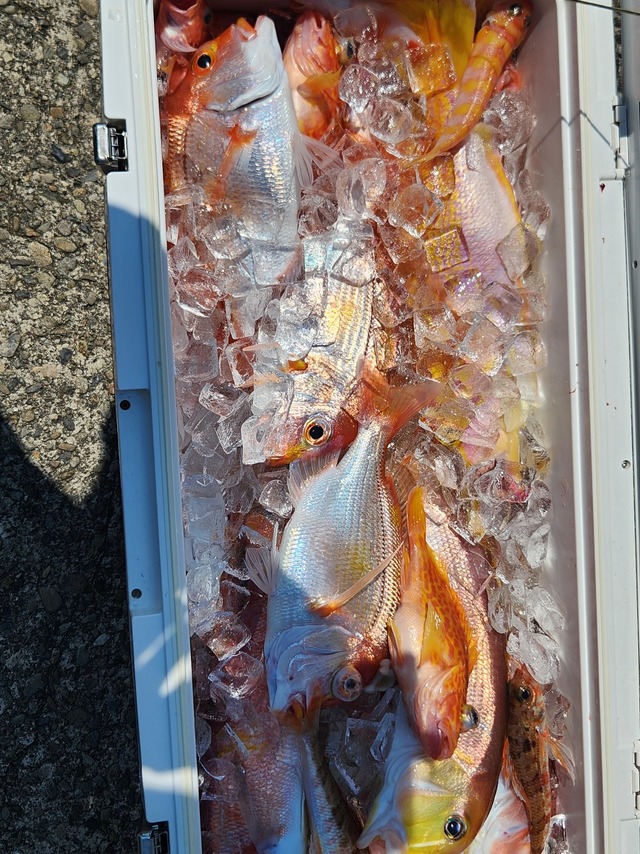 (アカアマダイ)アオリ ウッカリカサゴ またまた良い凪日和。 風は無くベタ凪。 今日も凪倒れたにならなければ 良いのですが? 今日もエギング→アマラバにて出船。 まずは朝一エギングから。 釣果どうでしょう? 落ち抱きでしたー。 今日はイカさん活性良いのか? サイズアップ。 キロアップおめでとう。 これも良型。 皆さんでイカさん5杯でしたー。 朝一ひとシャクリからパタパタ 釣って頂き今日は良いのか⁇ 後は続きませんでした。 諦めてアマラバへ 釣果どうでしょう? ジギングにて 目ん玉ドーン。ウッカリカサゴ。 鯛三連発。 最後に甘鯛おめでとう。 船中初甘鯛でした〜。 子供さん頑張って釣って頂きました。 さすが常連さん 激渋の中甘鯛GET。 もういっちょ甘鯛GET。 これきりでした。 整列です!! 今日はベタ凪でどうにも。 流れず大撃沈でした〜。。 ずーとバーチカルで当たりも少なく 当て逃げばかり。 常連さんも痺れてました。 ほんと酷い日でした。 最後までどうすることもできない状況で 良い所無しでした〜すいません。 クルクル巻き巻きお疲れ様でした 本日の御乗船ありがとうございました。 またのご利用お待ちしております。