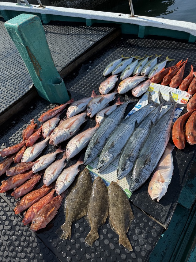 アマダイ 最大43cm 今日は朝から曇り。 雨の中あまり天気良く無いです。 まだ晴れより暑さはマシですね。 今日はアマラバにて出船。 釣果どうでしょう? おめでとう御座います。 整列です。 今日はアマラバだけで頑張って みましたがいまいち。 当たりもあんまり無く外道の活性も どうかなぁて感じ。 暑さもおちついてきたら また良くなって来ると思います。 皆さんチャレンジお待ちしております。 雨の中クルクル巻き巻きお疲れ様でした。 本日の御乗船ありがとうございました。 またのご利用お待ちしております。