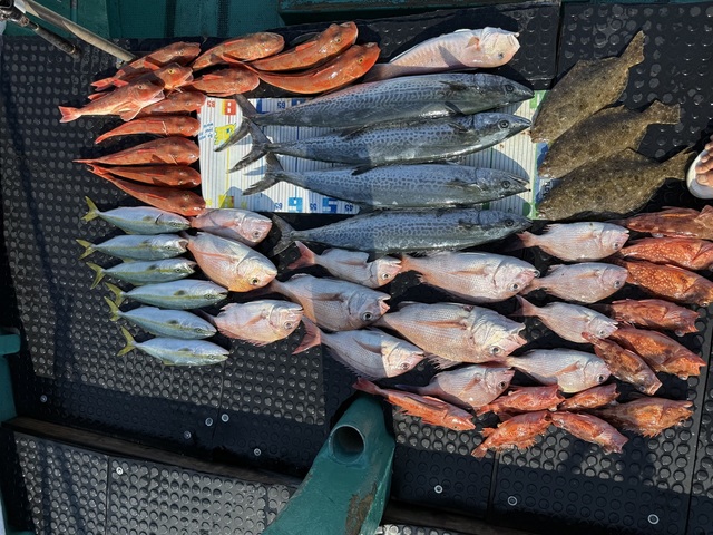 竿頭2匹 タイ ツバス シオ オオニベ サゴシ シイラ ハマチ タイラバジギング午後便。 日の入りごろまでなので季節により帰港時間は異なりますがご了承いただきベイトのもとへ。 ブリやサワラは昼前からどこかへ行ったのか釣れず。鯛、ツバスやシオが相手してくれました。 海釣り初?の方が出だし調子よくパタパタと釣っていただきました!バス釣り師は海に出てもつかむのがはやい。 そこからポロポロですが魚を集めてラストに白甘鯛を狙いに!やはり連発することはないですがお一人が2匹!釣り方がはまった感じでした。 そこでジグを落として、オオニベとサゴシも追加。 真鯛は元気なしでした。 あきらめず釣りを続けていただきありがとうございました。