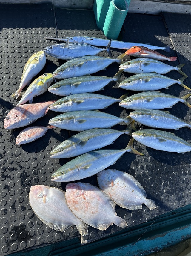 (スマ)マダイ 最大50cm 合計1匹 ヒラメ 最大58cm 合計1匹 ツバス 最大40cm 4~5匹 カマス イサキ アジ 2号船午前便タテ釣り 5:30〜12:30までタテ釣り ポイント石鏡沖 仕掛け太サビキの7本針、ハリス8号オモリ60号 マダイ50㎝1枚 ヒラメ58㎝1枚 ツバス40㎝4〜5本 その他、スマガツオ、カマス、イサキ、アジ 今日も暑い日でしたねベイト反応ありですがイワシが付いたら付かなかったりで難しそうでしたね、イワシ付くとツバスが食ってくる見たいな感じでした。