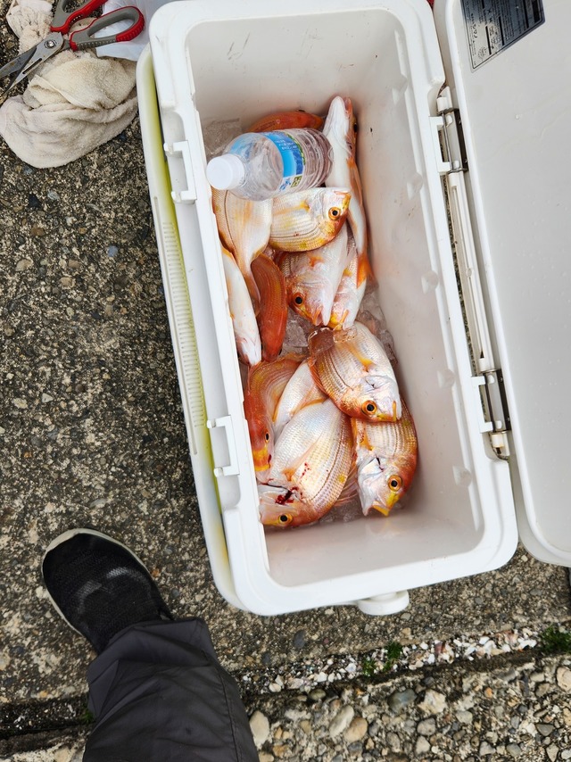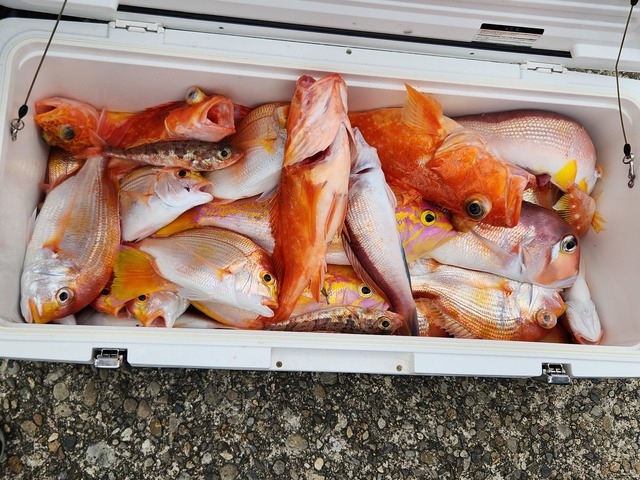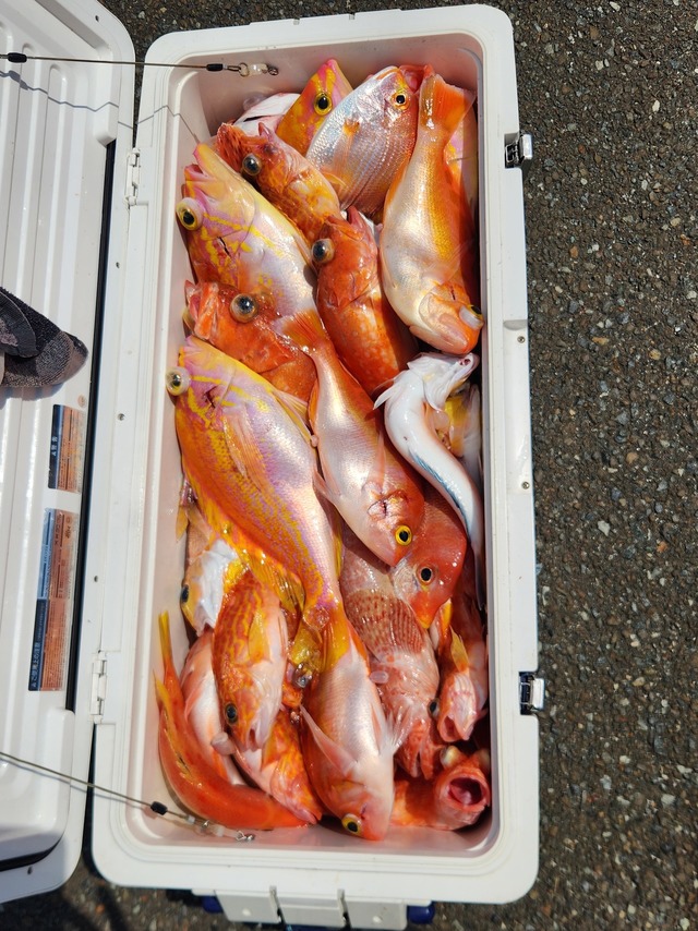 11~46cm 3~8匹 アマダイ 33~51cm 4~11匹 アマダイ、アカイサギ、レンコダイ、ウッカリカサゴ、鬼カサゴ他いろいろ頑張って釣ってくれました。常連さん二人いつも有り難うございます。 ちなみに1人クーラーぎっしり。