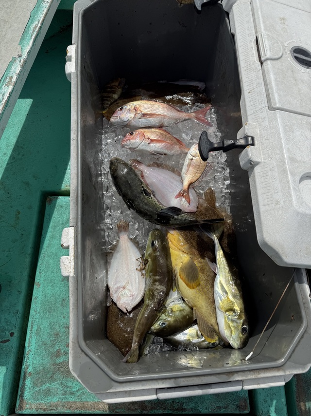 マダイ 24~66cm 2~4匹 カサゴ キジハタ ウマヅラハギ イラ 12:30〜18:30までウタセマダイ ポイント石鏡沖 仕掛け胴突き3〜4本針、ハリス5号オモリ10〜30号エサウタセエビ マダイ2〜4枚24〜66㎝ その他、カサゴ、キジハタ、ウマヅラハギ、イラ、トラフグ、 昼からも潮早く当たり少なかったですねたまに顔見るぐらいでした。