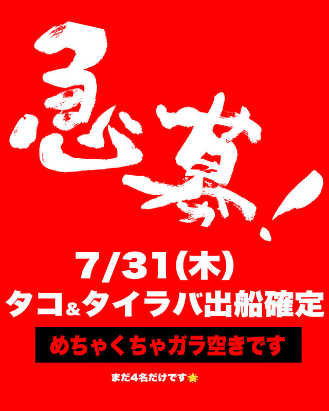 25~50cm 0~5匹 タコ 0.20~2.50kg 0~5匹 朝便。チャーター鯛カブラ、タコ釣り便。
