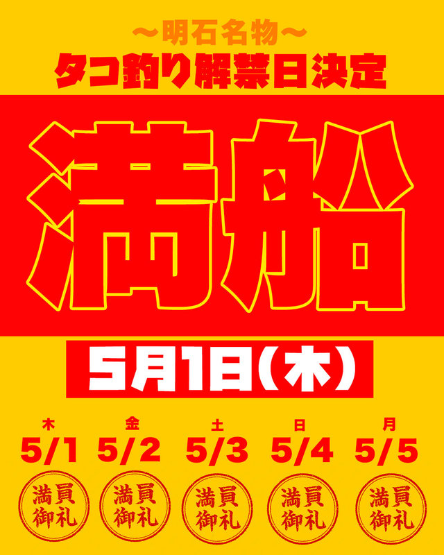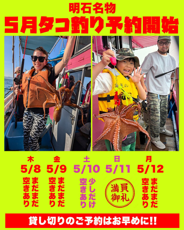今週末の鯛は激しぶ。 50オーバーはゲットならず! 当たり少なく厳しい週末でした。 鯛ラバより鯛サビキの方が釣れてました。 5月からタコ待ちに待ったタコ釣り。 まだまだ空いてるので 宜しくお願い致します。