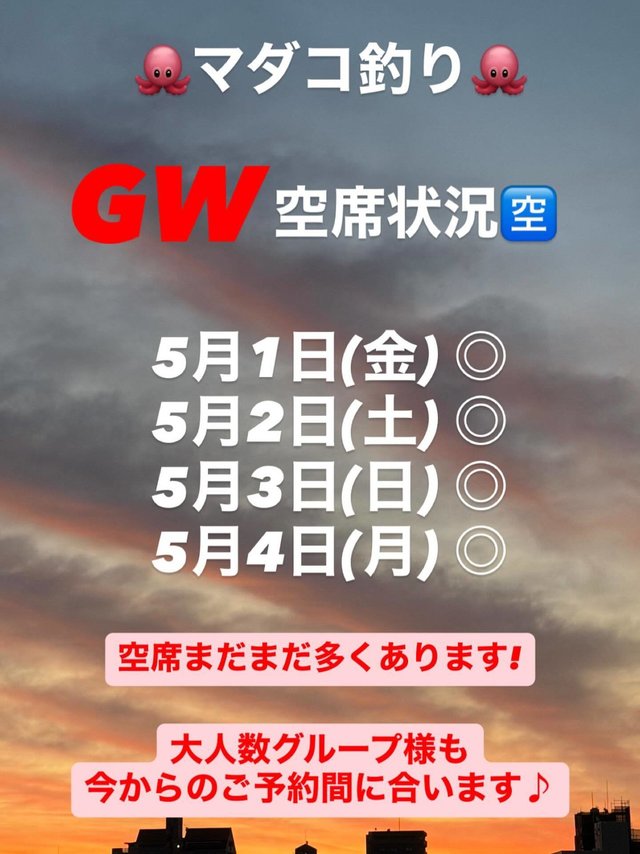 (ブリ)合計4匹 サワラ 合計1匹 タイ 合計2匹 今シーズン初ジギングで出船! 少人数で出船でしたが 全員安打とはなりませんでしたが、 釣って貰えました。 5月からの タコ便.ジギング便募集中です。 その他の日も ジギング便募集中です。